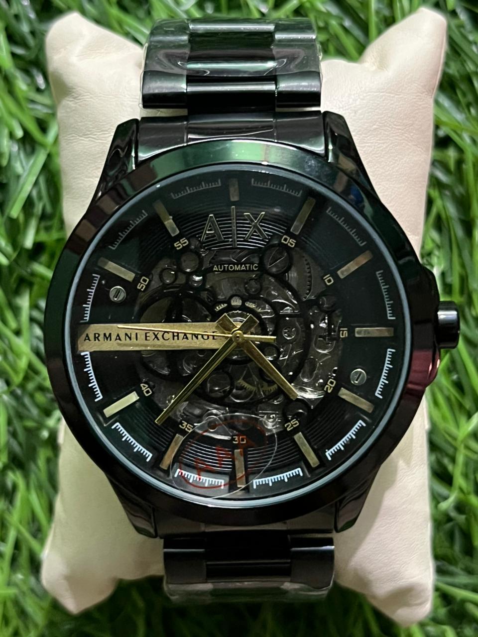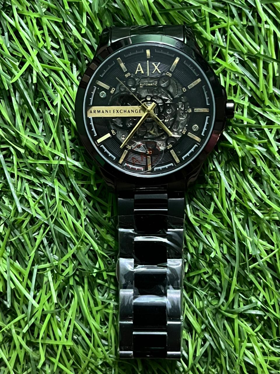 This bold Arm🔥ni Exch🔥nge automatic timepiece features a sophisticated black skeleton dial with gold-tone accents, revealing the intricate mechanical movement. Encased in a durable black stainless steel body with a matching link bracelet, it's a statement of modern luxury. Price: ₹2,750/-