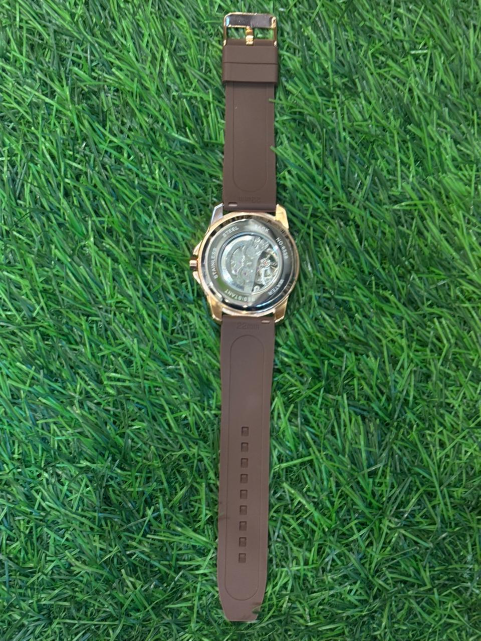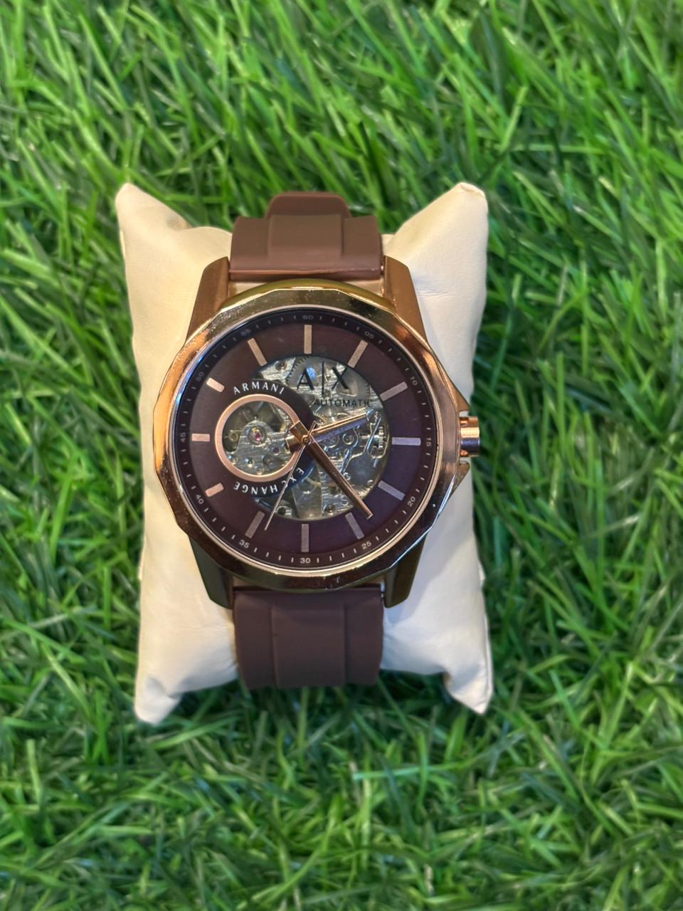This striking Arm🔥ni Exch🔥nge automatic watch combines a rich brown silicon strap with a luxurious rose gold-tone case. The sophisticated skeleton dial reveals the intricate inner workings of the self-winding movement, offering a perfect blend of modern style and classic watchmaking. Price: ₹2,699/-