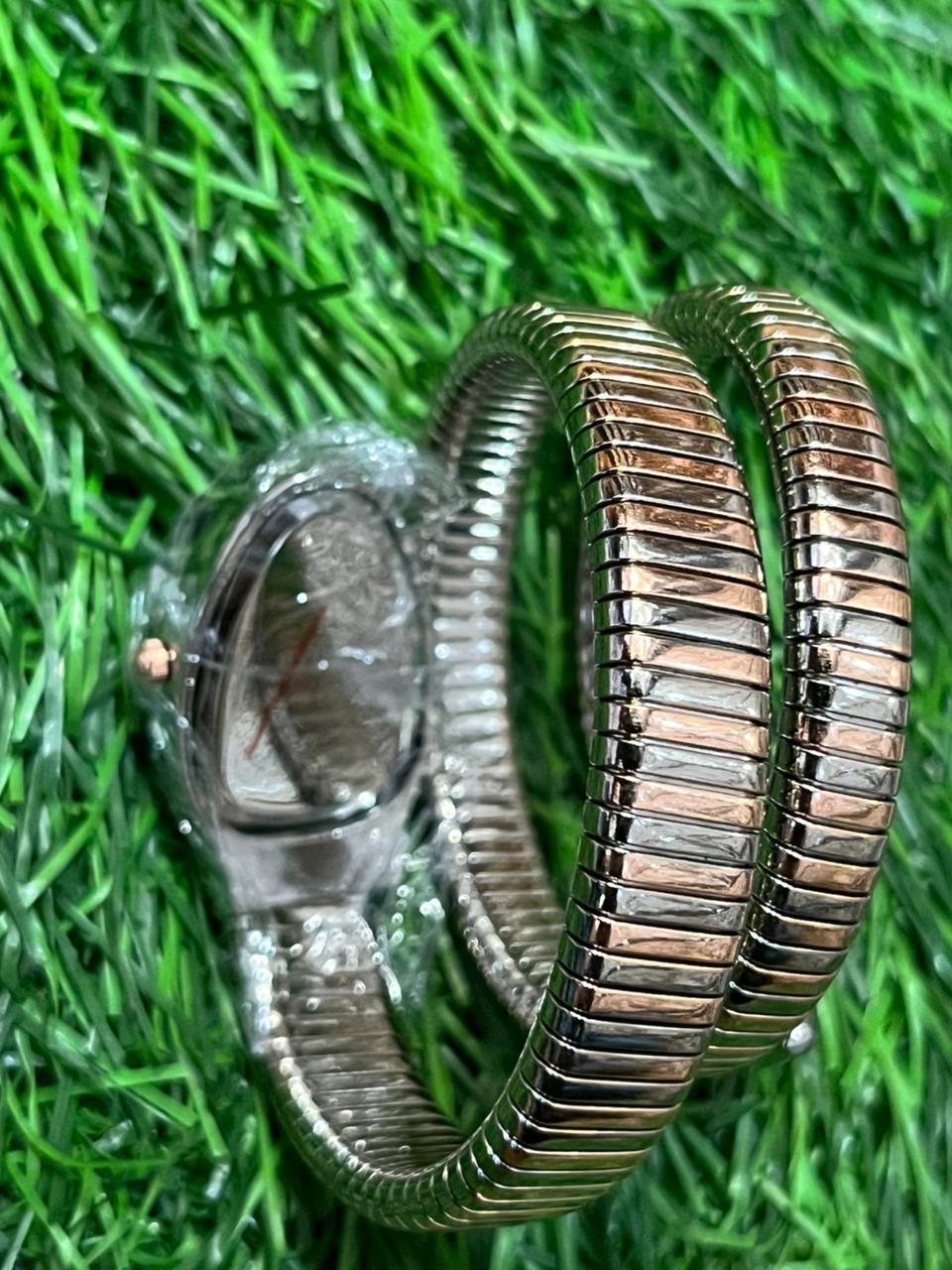 An iconic B🔥lg🔥ri "Serpenti" style watch for ladies. This timepiece features a striking snake-head case in rose gold-tone, set with brilliant crystals framing a dark, elegant dial. The flexible gunmetal-tone "Tubogas" style bracelet coils elegantly around the wrist, blending jewelry and horology in one stunning piece. Price: ₹2,149/-