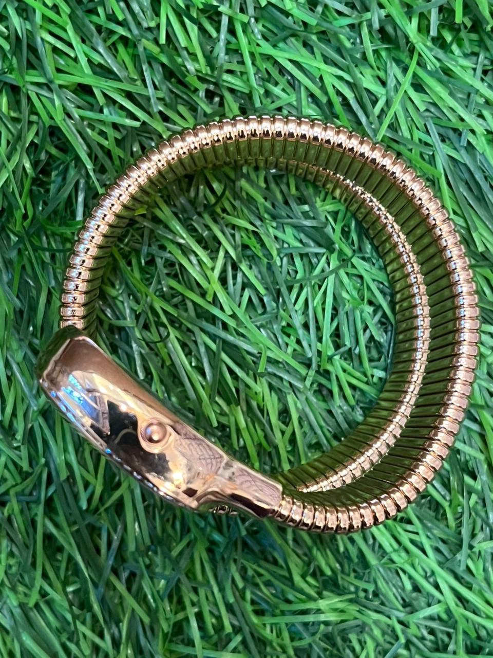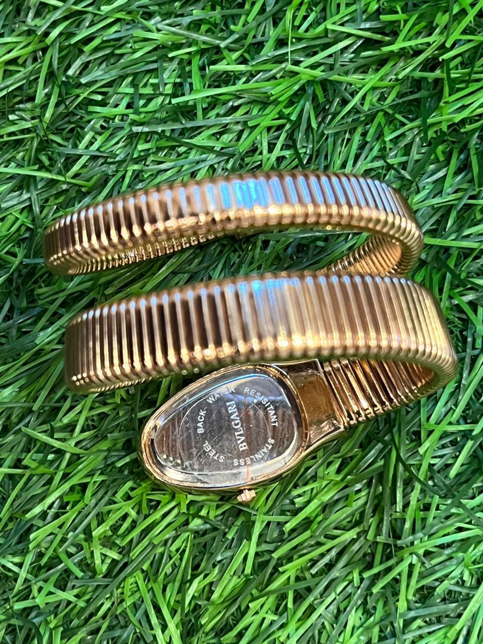 An iconic B🔥lg🔥ri "Serpenti" style watch for ladies. This timepiece features a striking snake-head case in a full rose gold-tone finish, set with brilliant crystals framing an elegant white dial. The flexible rose gold-tone "Tubogas" style bracelet coils elegantly around the wrist, blending jewelry and horology in one stunning piece. Price: ₹2,150/-