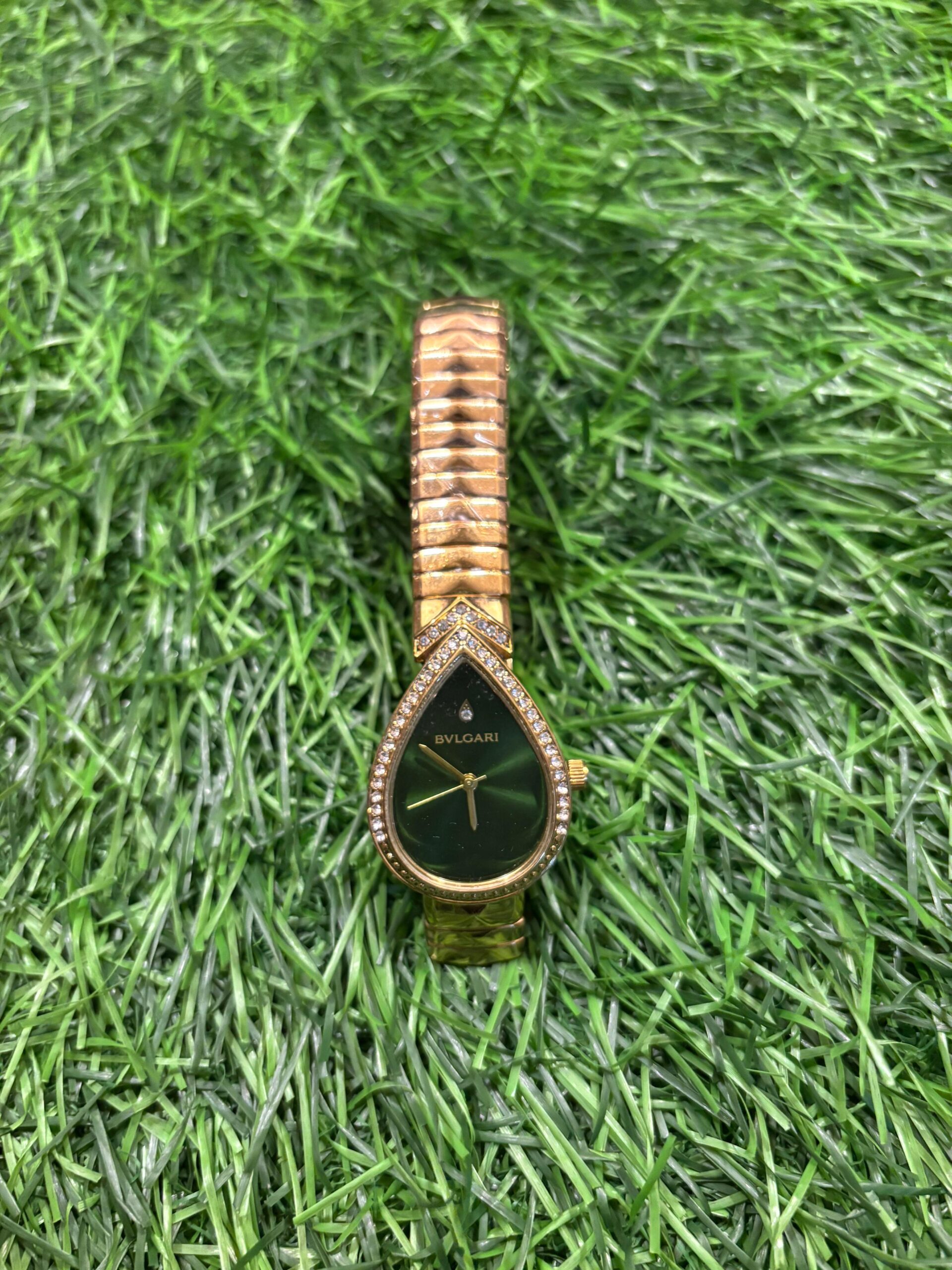 This stunning B🔥lg🔥ri ladies' watch features a unique teardrop-shaped case in a beautiful golden finish, elegantly framing a deep green dial. The bezel is adorned with sparkling stones, adding a touch of glamour to this exquisite timepiece. Price: ₹1,949/-