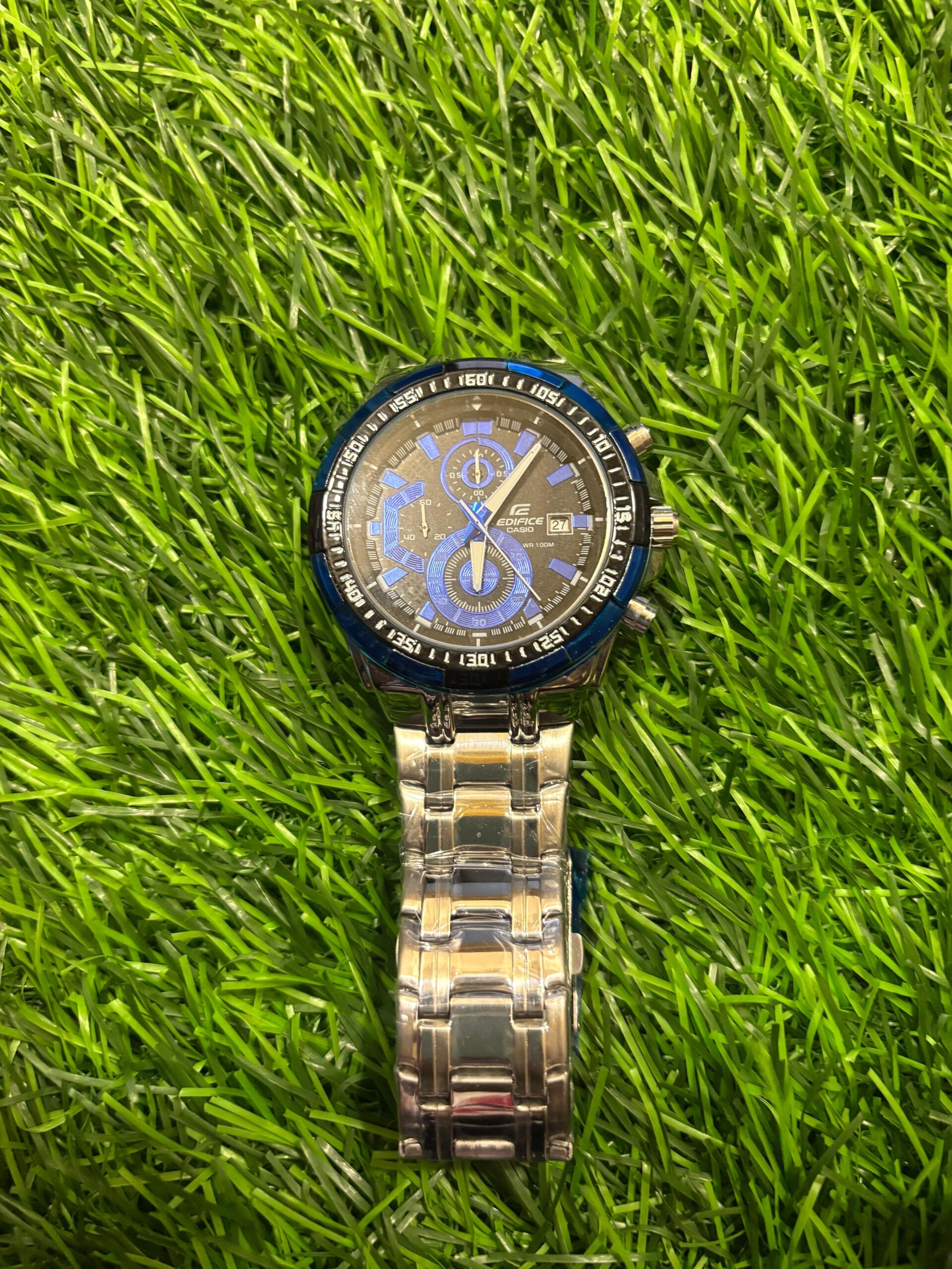 This C🔥si🔥 Edifice watch combines a classic silver chain with a striking blue bezel and dial. It's a versatile timepiece that's perfect for both casual and formal occasions, offering a blend of style and reliability. Price: ₹1,999/-