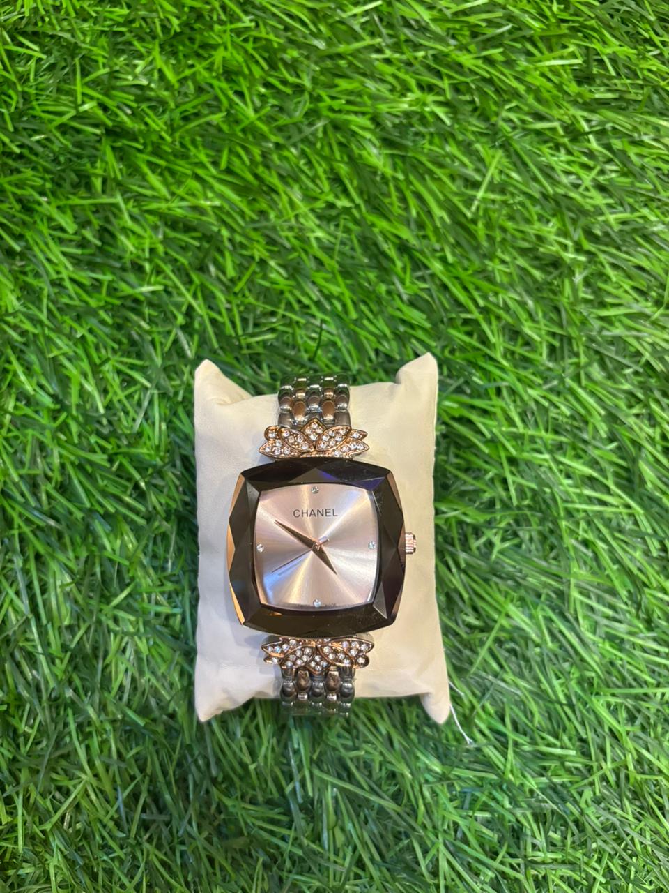 Exude timeless sophistication with this stunning Ch🔥nel ladies' watch. Its unique cushioned square case and elegant silver sunray dial create a look of modern chic. The dual-tone bracelet is exquisitely detailed with crystal-embellished floral links, making this timepiece a true piece of jewelry. Price: ₹2,249/-