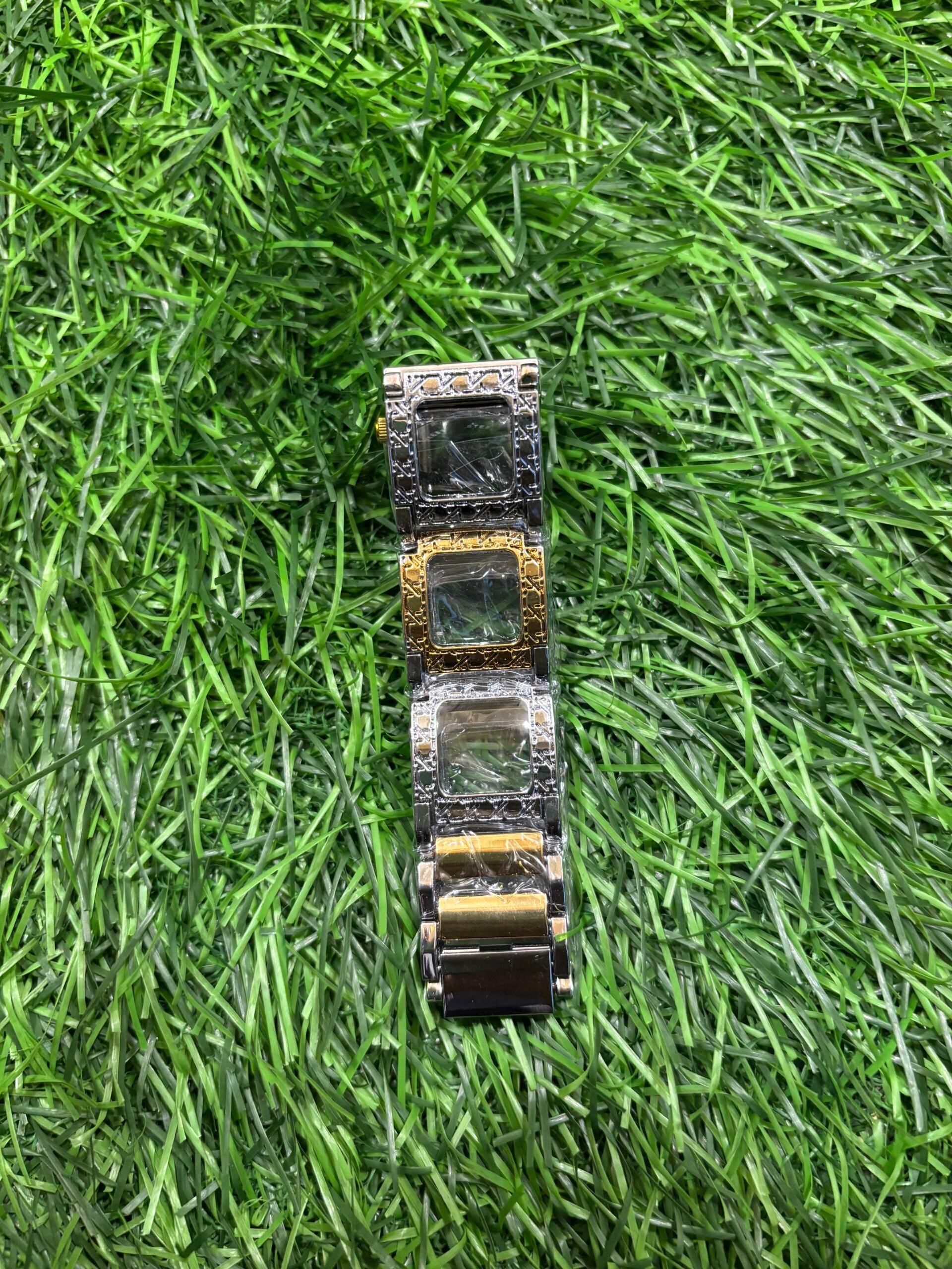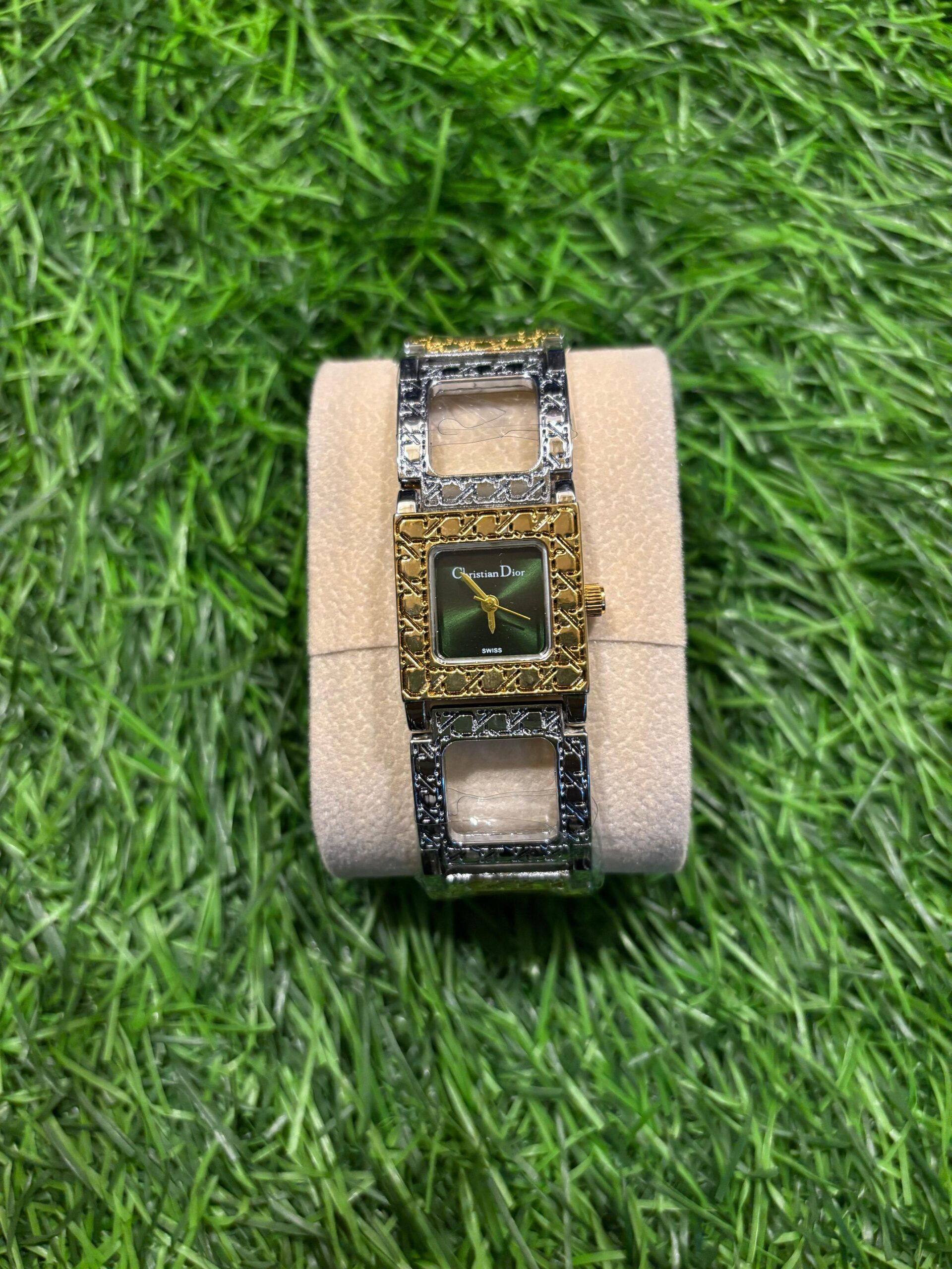 This elegant D🔥or ladies' watch features a unique dual-tone bracelet with textured gold and silver links. The sophisticated design is completed with a stunning dark green dial, making it a perfect statement piece. Price: ₹1,999/-