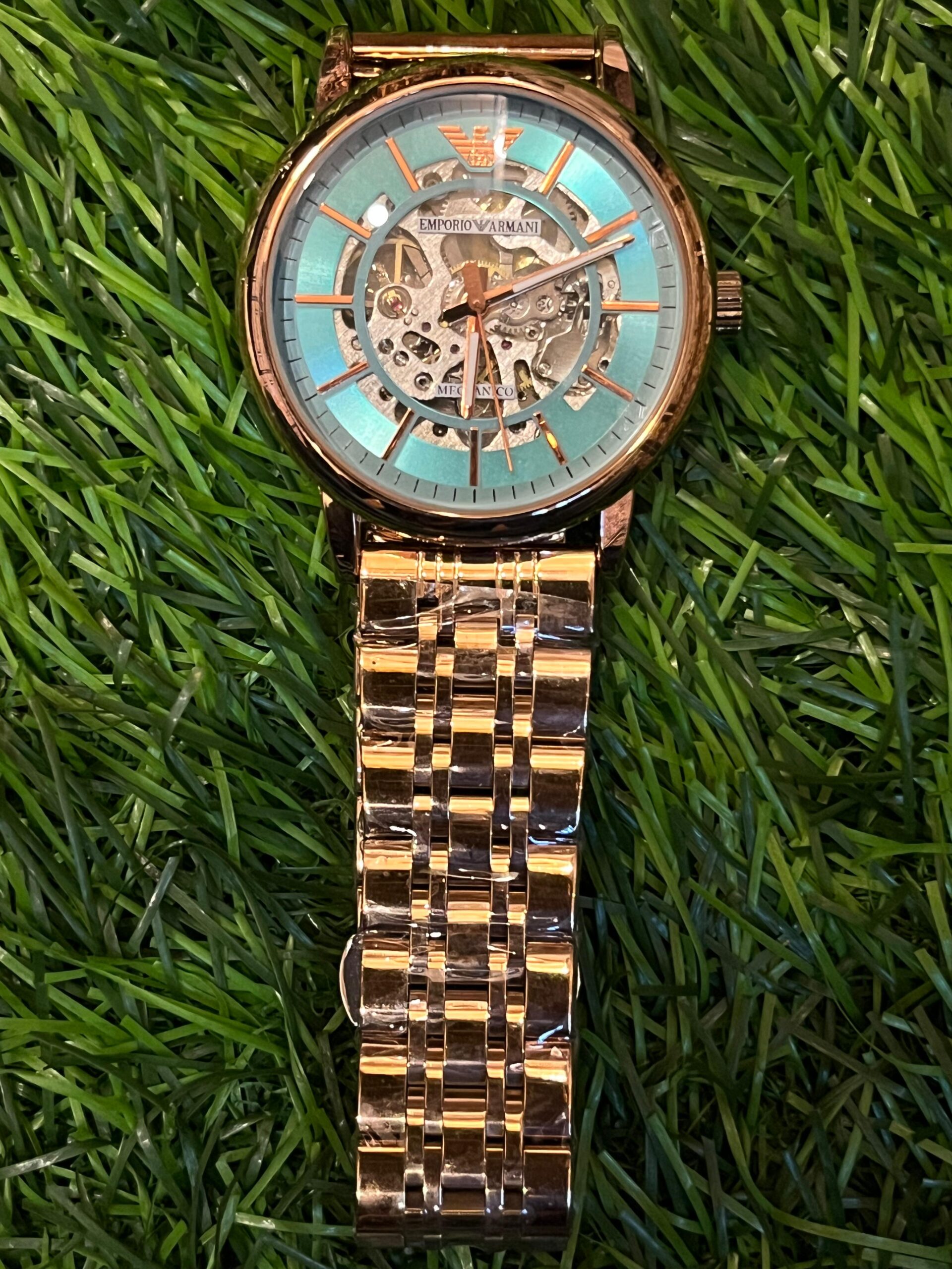 This striking Emp🔥rio Arm🔥ni automatic watch features a captivating teal skeleton dial, revealing the intricate 'Meccanico' movement inside. The case and bracelet are finished in a warm copper/rose gold tone, making it a sophisticated timepiece for men. Price: ₹2,749/-