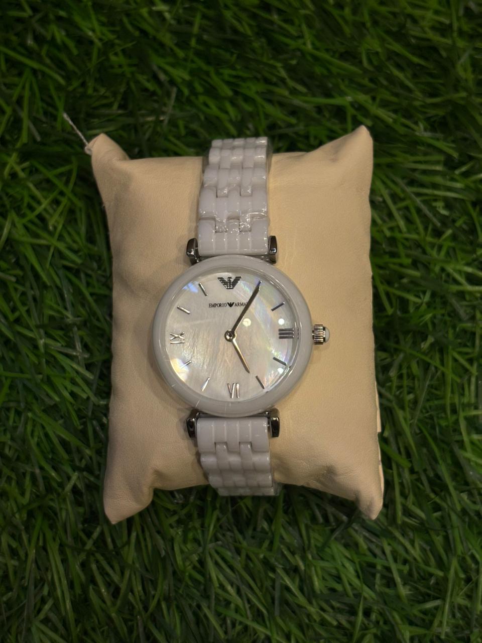 This stunning Emp🔥rio Arm🔥ni ladies' watch is the epitome of clean, modern elegance. The beautiful mother-of-pearl dial with crystal hour markers is housed in a crisp white ceramic case and matching bracelet. It's a sophisticated and contemporary timepiece for the fashion-forward woman. Price: ₹2,699/-
