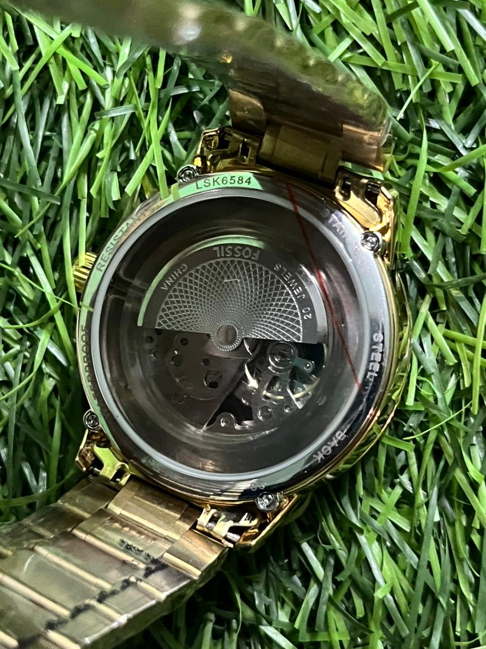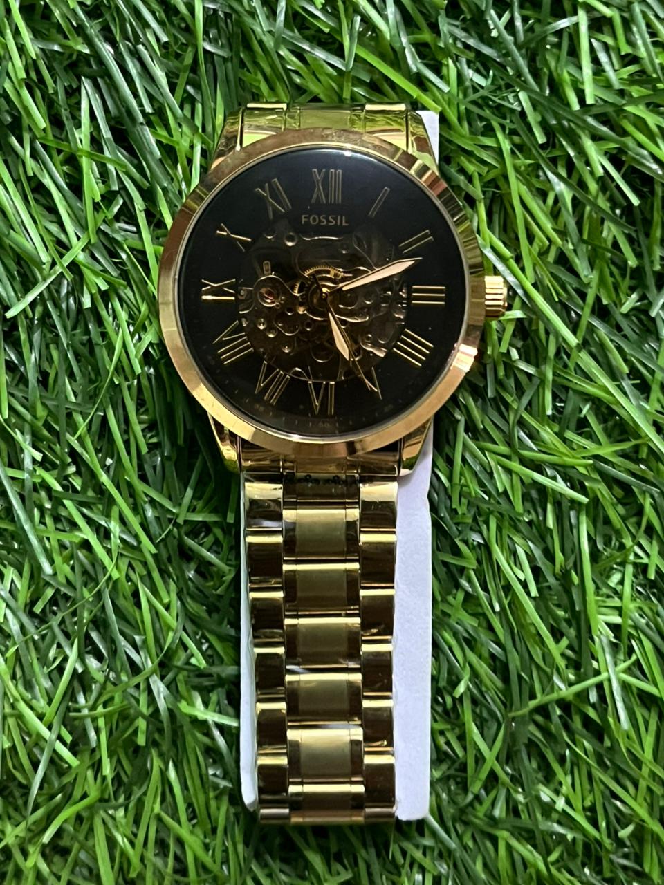 A luxurious F🔥ssil automatic timepiece showcasing a rich gold-tone finish. The center stage is taken by a black skeleton dial adorned with classic gold Roman numeral markers, offering a perfect view of the self-winding mechanical movement. A sophisticated blend of tradition and modern style. Price: ₹2,950/-
