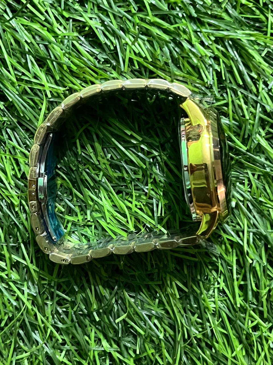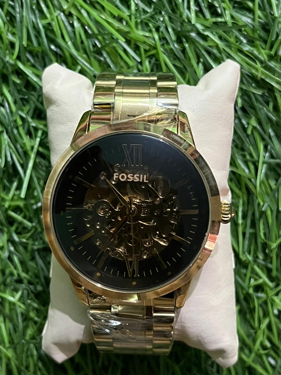A luxurious F🔥ssil automatic timepiece showcasing a rich gold-tone finish. The center stage is taken by a black skeleton dial adorned with classic gold Roman numeral markers, offering a perfect view of the self-winding mechanical movement. A sophisticated blend of tradition and modern style. Price: ₹2,950/-