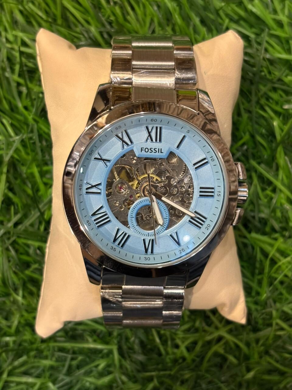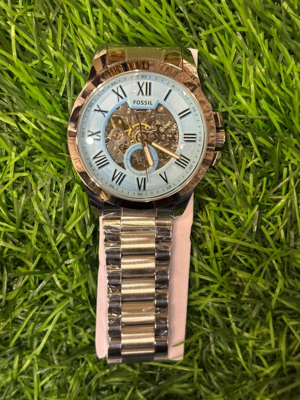 This classic F🔥ssil automatic watch combines timeless design with a modern twist. The polished silver stainless steel bracelet is elegantly contrasted by a warm rose gold-tone bezel. The striking light blue dial features classic Roman numerals and a large skeleton window, offering a captivating view into the intricate automatic movement that powers the watch. Price: ₹2,699/-
