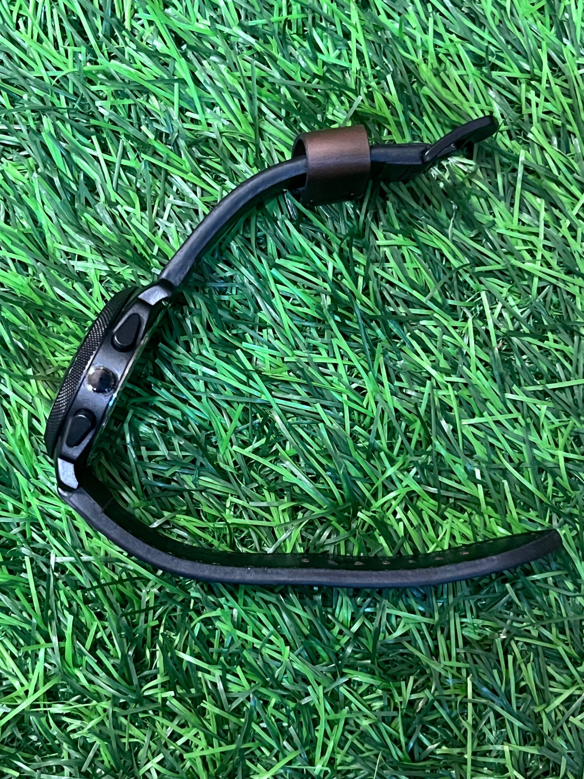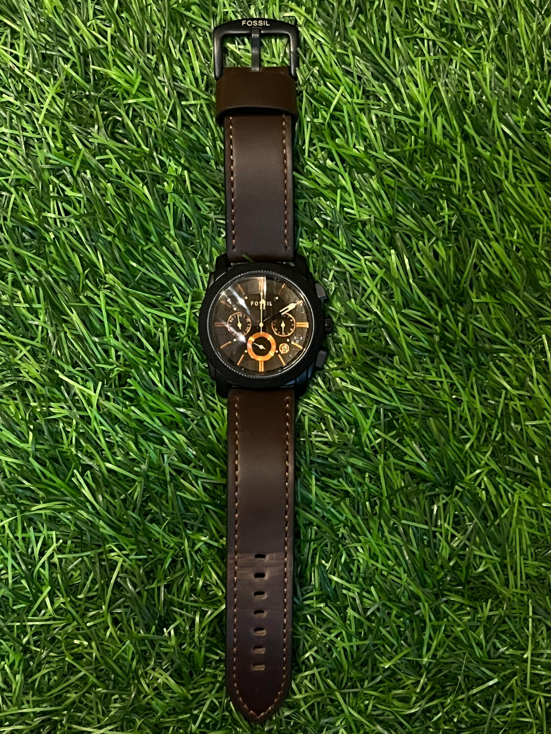 This classic F🔥ssil chronograph features a rugged black stainless steel case with a knurled bezel, paired with a rich brown leather strap. The black dial has contrasting bronze-tone sub-dials and markers, offering a timeless, masculine look. All chronographs and the date are functional. Price: ₹1,949/-