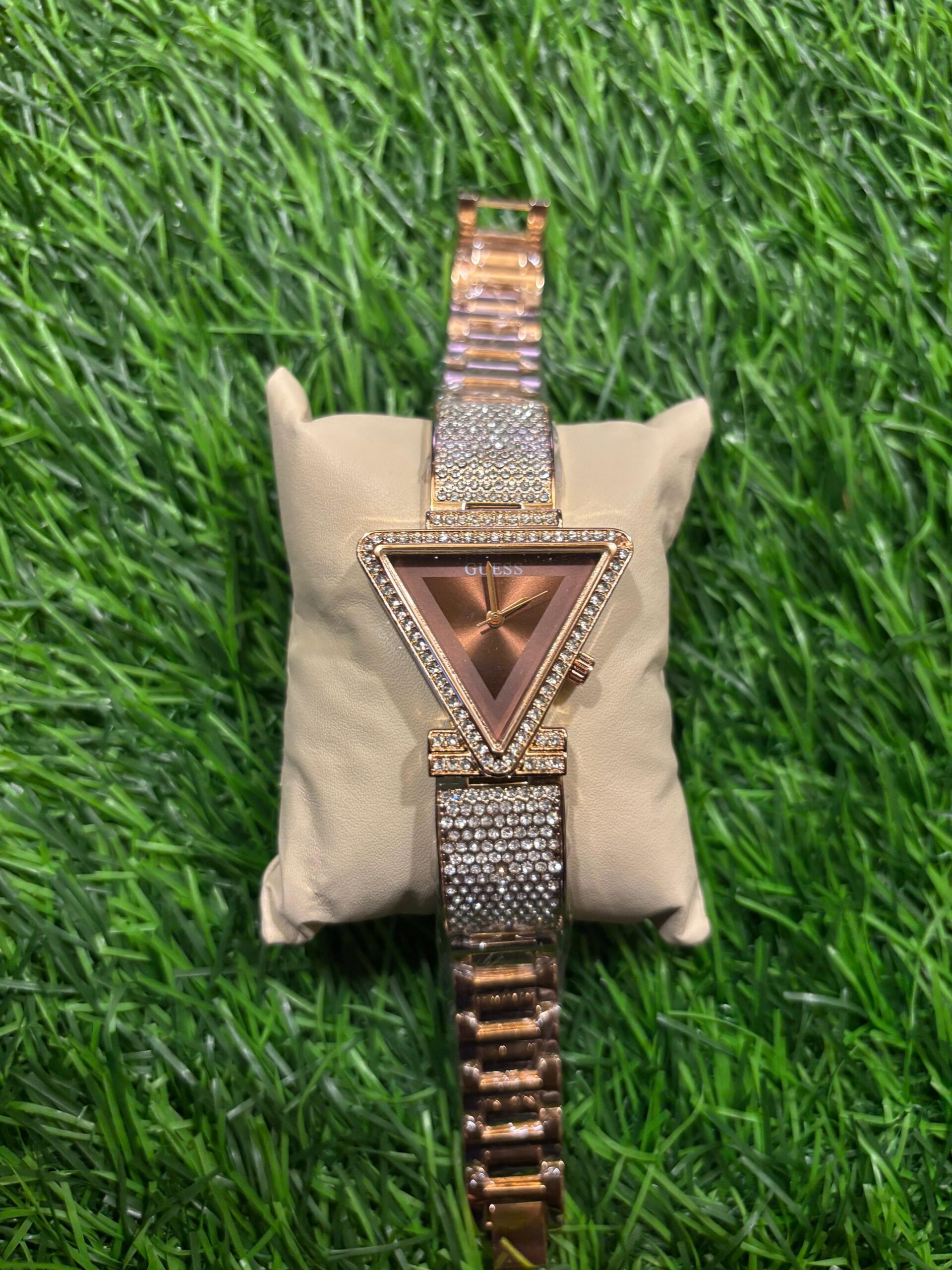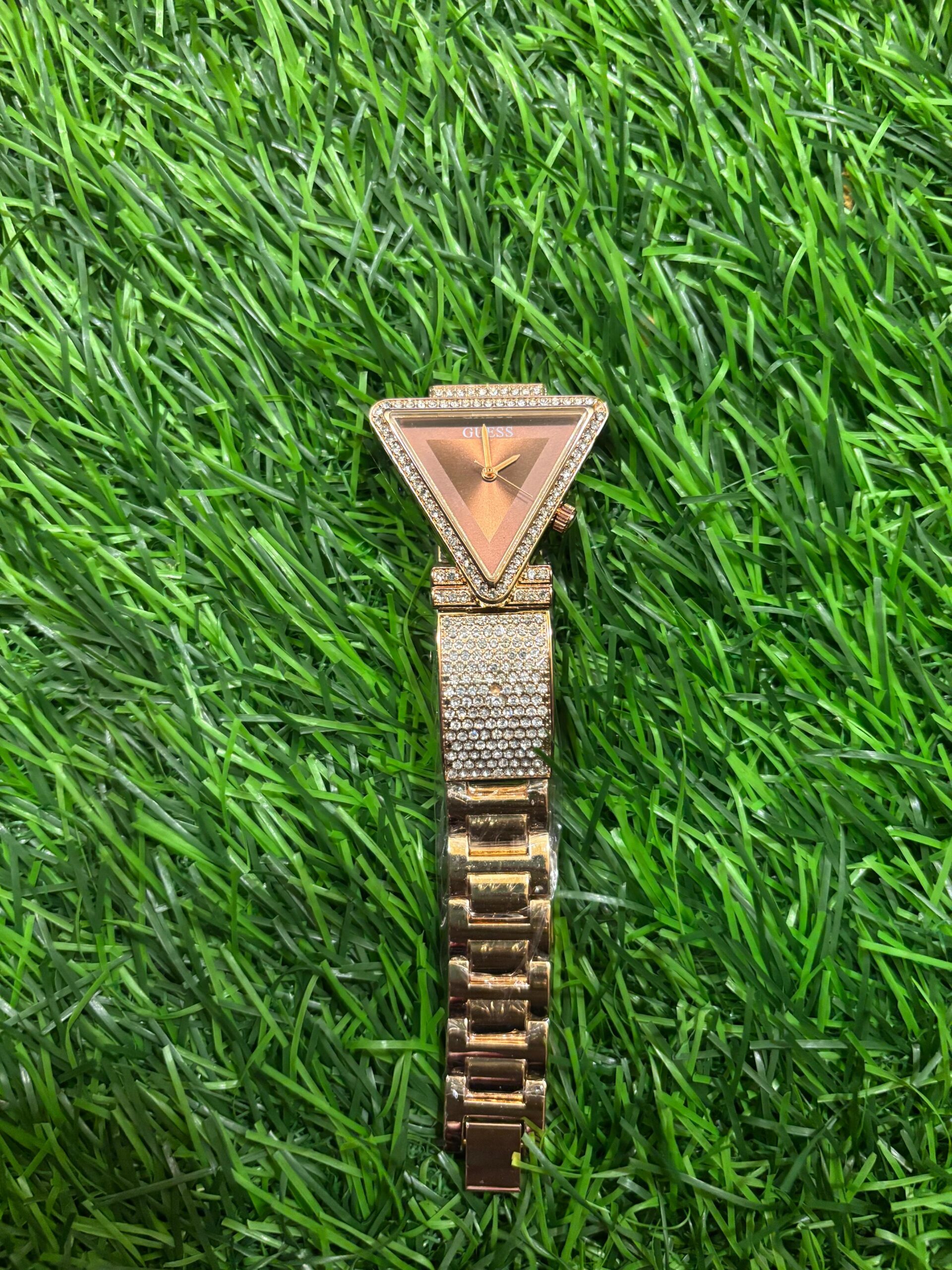 Make a dazzling impression with this G🔥ess ladies' watch. Its unique triangular case and crystal-studded bracelet create a look that is both modern and glamorous. The rich brown dial perfectly complements the warm rose gold tones, making this a true statement piece. Price: ₹2,099/-