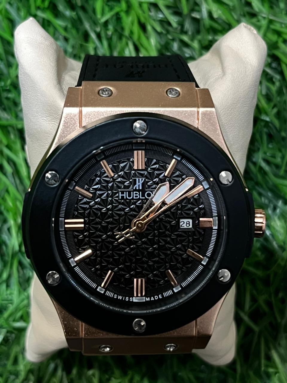 This H🔥bl🔥t Big Bang watch features a striking textured black dial with a date window, housed in a bold, polished rose gold-tone case. The iconic bezel with H-shaped screws and the comfortable black rubber strap complete this sporty, luxurious look. Price: ₹1,899/-