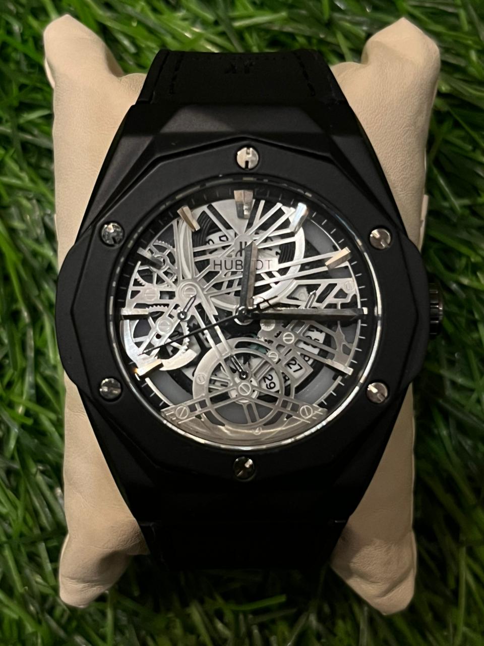 This striking H🔥bl🔥t automatic watch features a mesmerizing full skeleton dial, revealing the intricate self-winding movement with silver-tone mechanics. The watch has a classic matte black case, accented by a comfortable and stylish black leather/rubber strap. Price: ₹1,799/-