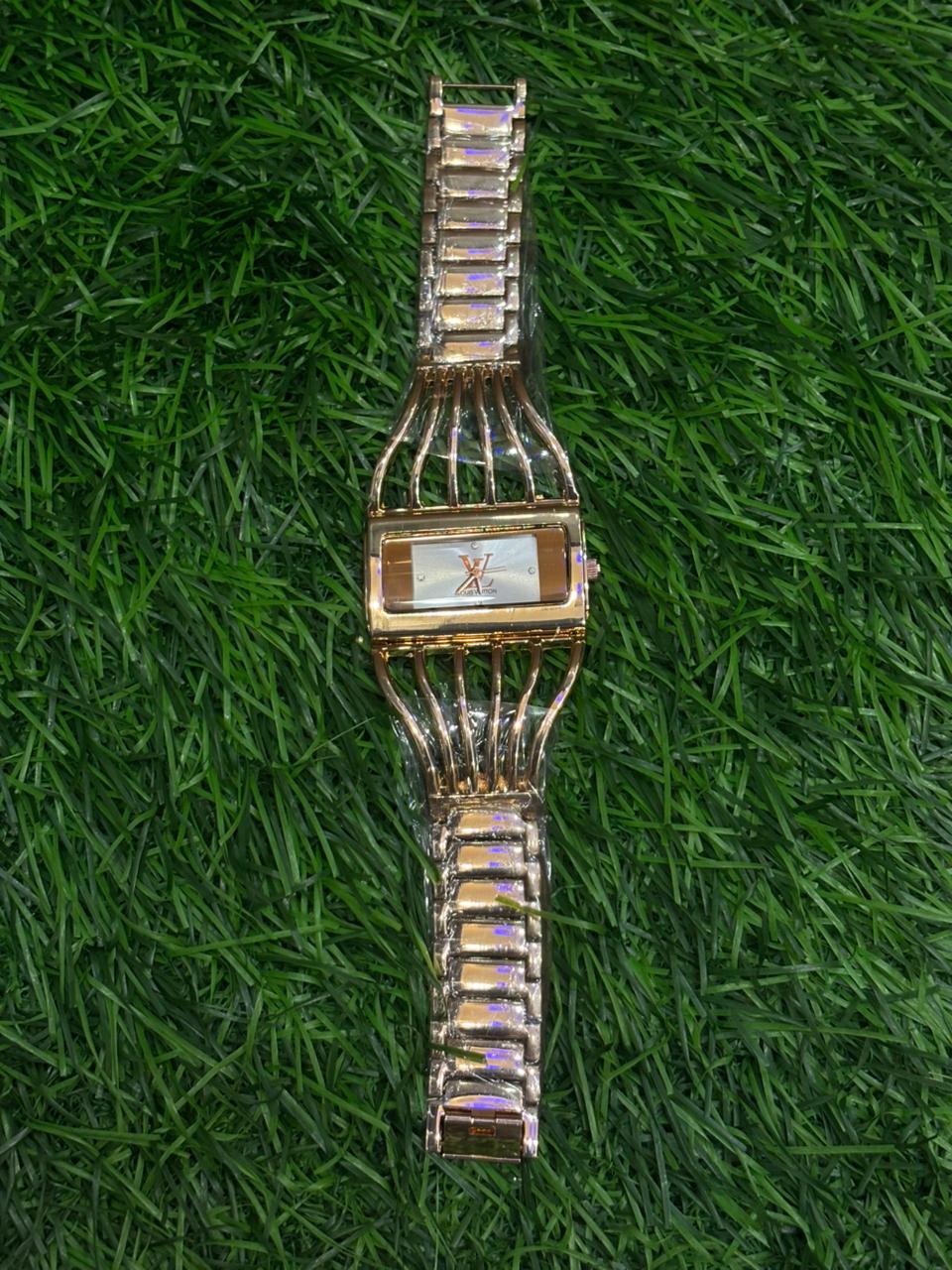 This architecturally stunning L🔥uis Vuitt🔥n watch makes a bold fashion statement. The unique, caged bracelet design flows seamlessly into the rectangular case, all in a beautiful copper-tone finish. The minimalist dial features the iconic LV monogram, creating a look that is both modern and unmistakably luxurious. Price: ₹1,999/-