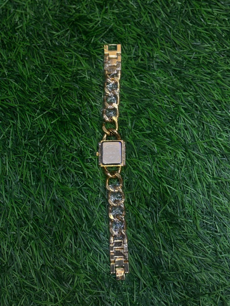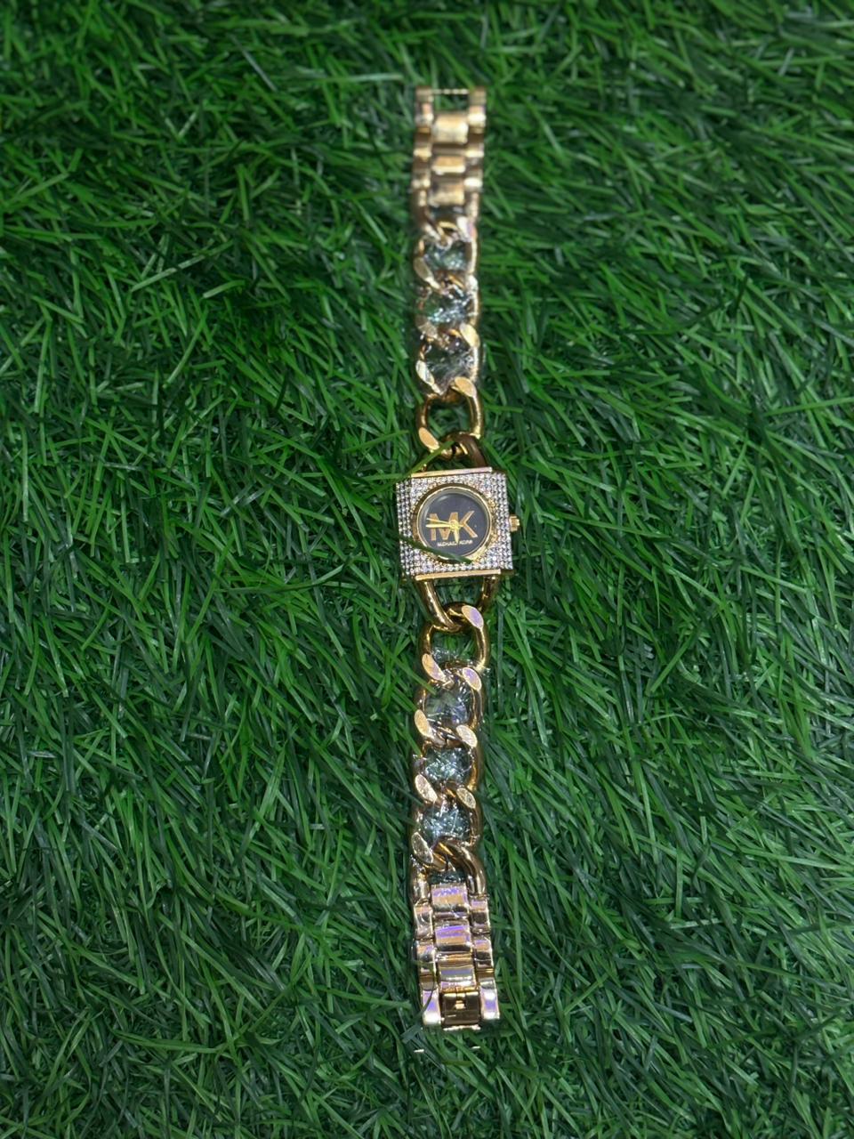 Unlock your style with this unique M🔥chael K🔥rs ladies' watch. The timepiece features a stunning, crystal-pavé case shaped like a padlock, centered on a chunky gold-tone chain bracelet. The dark, minimalist dial with the MK logo adds a touch of modern sophistication, making this watch a true fashion statement. Price: ₹2,099/-