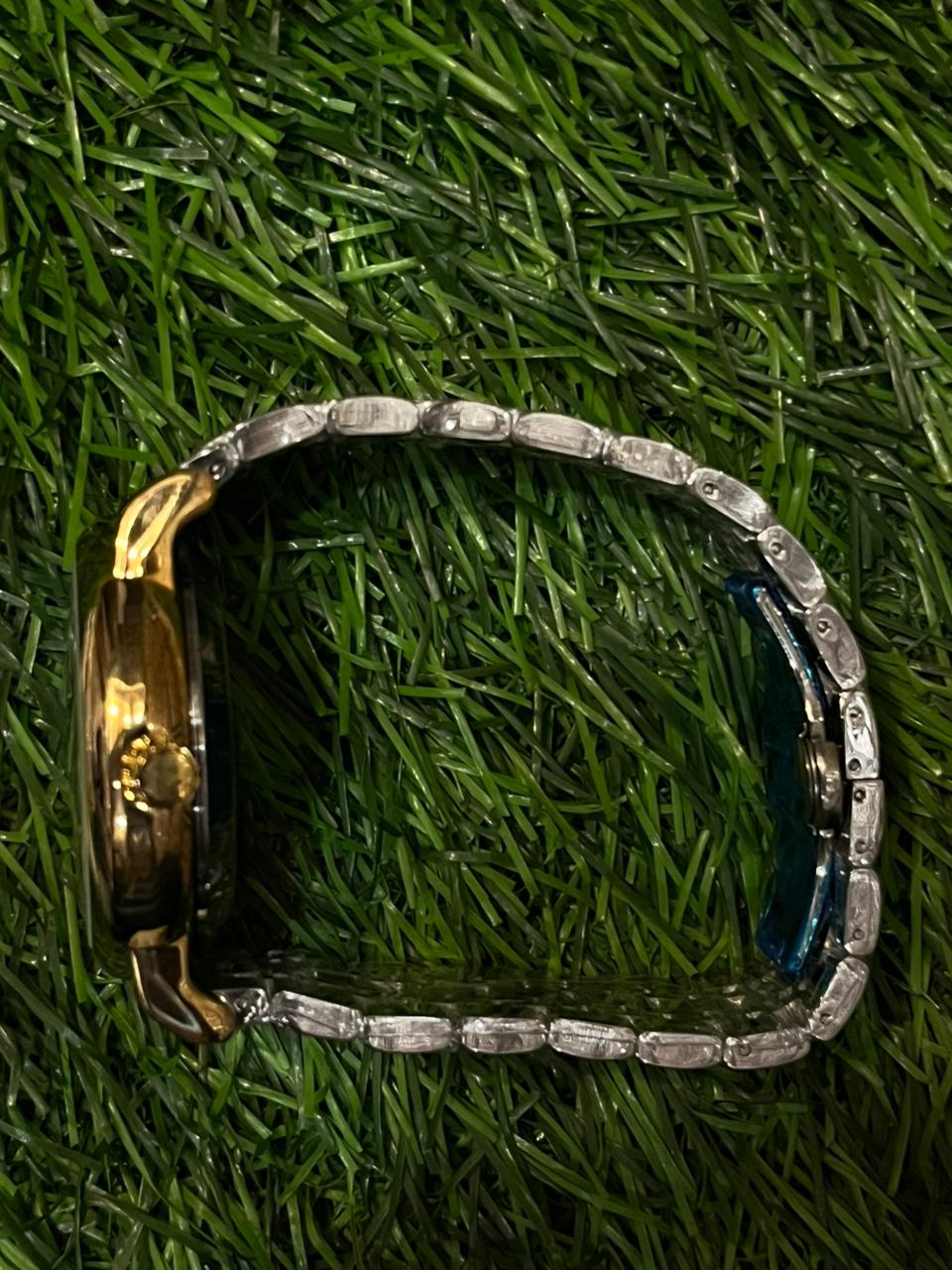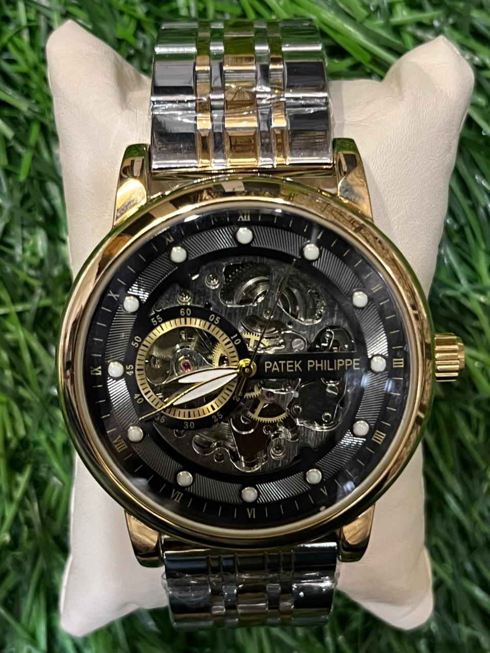 This luxurious P🔥tek Ph🔥lippe timepiece features a brilliant automatic skeleton movement, visible through the dial. The intricate mechanics are framed by a black and gold chapter ring, all housed in a stunning, full golden-tone case and bracelet. A true statement of mechanical art. Price: ₹2,899/-