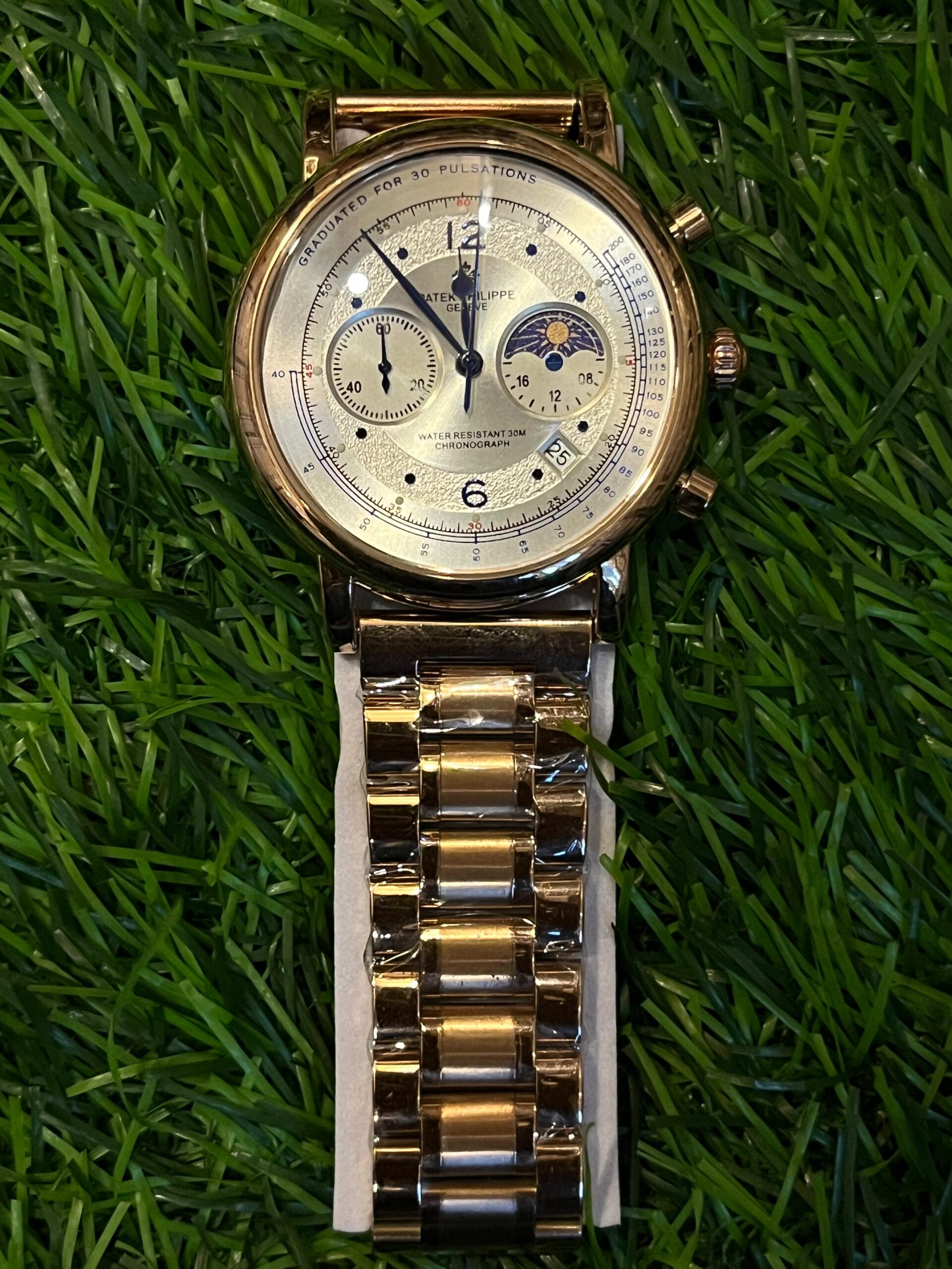 A highly intricate P🔥tek Ph🔥lippe Geneve replica for men. This stunning watch features a detailed chronograph dial with multiple sub-dials, a moonphase indicator, and a date window. The entire piece is finished in a brilliant copper/rose gold tone, from the case to the stainless steel bracelet. Price: ₹3,799/-
