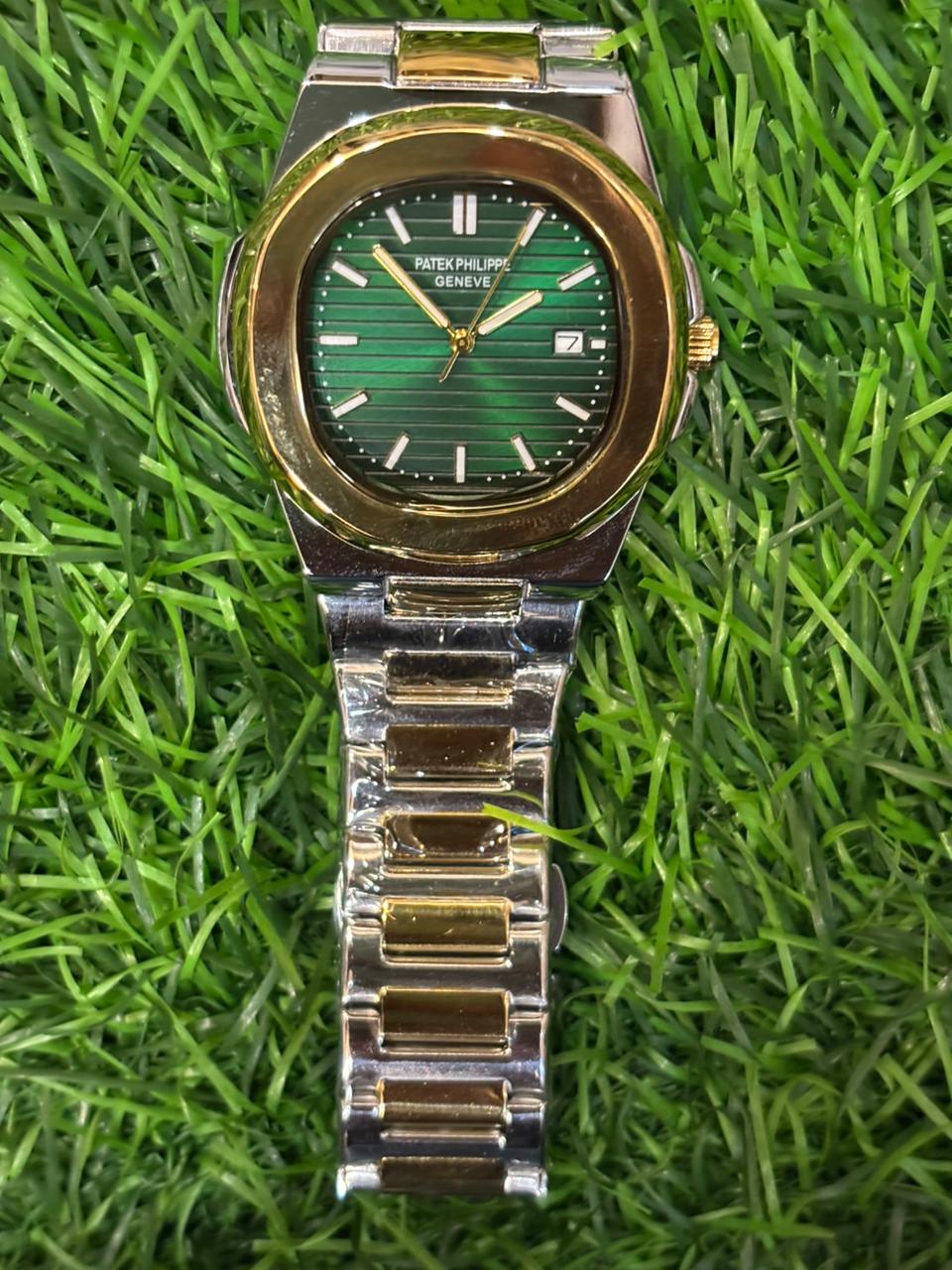 Elevate your style with this iconic P🔥tek Ph🔥lippe timepiece. It features a stunning sunburst green dial with a date window, set in a distinctive gold-tone bezel. The look is completed by a glossy dual-tone silver and gold stainless steel bracelet. Price: ₹2,299/-