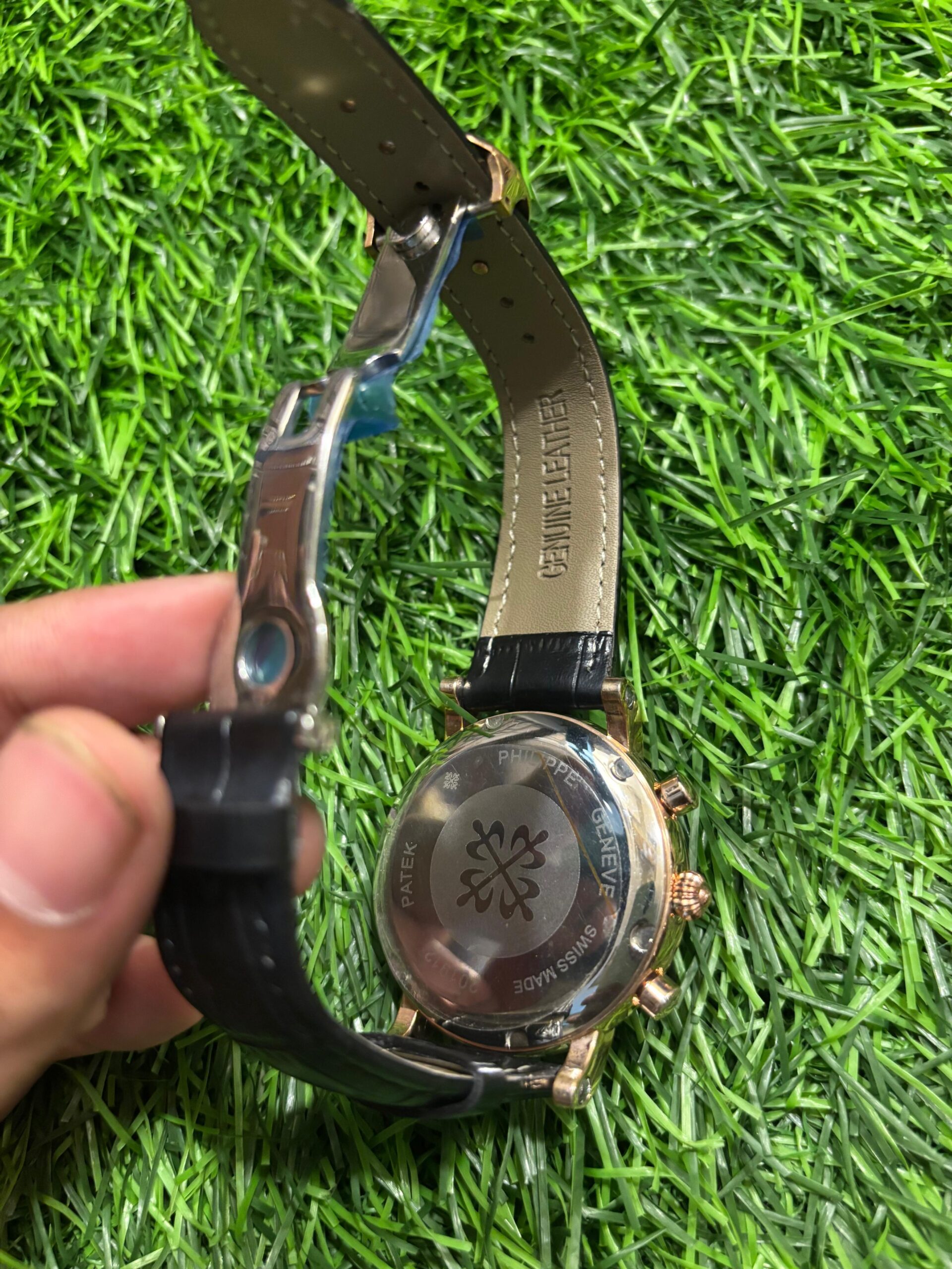 The P🔥tek Ph🔥lippe chronograph with moonphase is the pinnacle of watchmaking artistry. This exquisite timepiece features a detailed black dial with functional chronograph sub-dials and a beautiful moonphase complication. Housed in a polished rose gold case and paired with a premium black leather strap, this watch is a symbol of ultimate luxury and sophistication. Price: ₹2,499/-