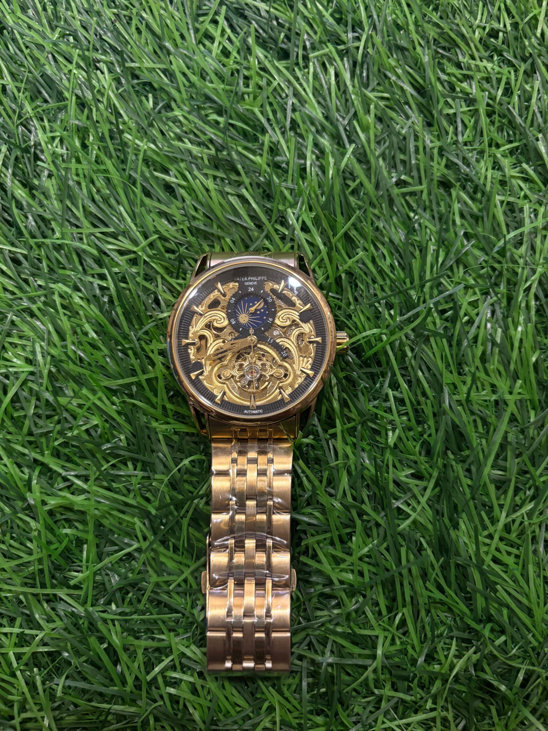Experience the art of watchmaking with this stunning P🔥tek Ph🔥lippe skeleton watch. The intricate automatic movement is on full display, framed by a luxurious gold and black dial. A true masterpiece of design and engineering. Price: ₹2,799/-