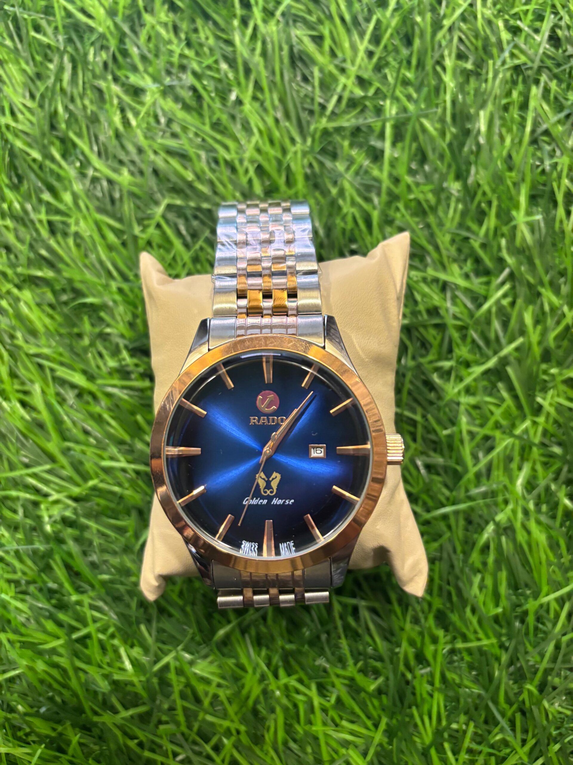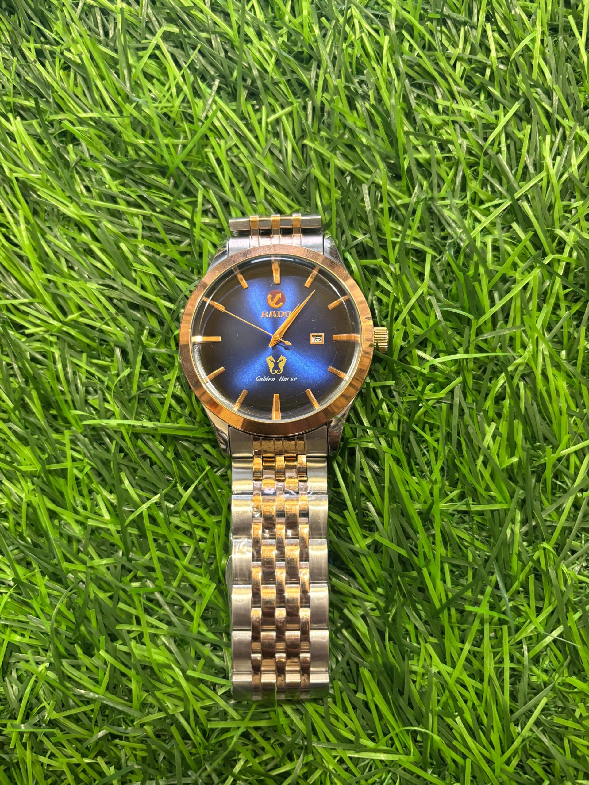 A masterpiece of classic design, this R🔥do Golden Horse watch features a stunning sunburst blue dial contrasted with a luxurious dual-tone rose gold and silver chain. An elegant and timeless choice for any occasion. Price: ₹2,099/-