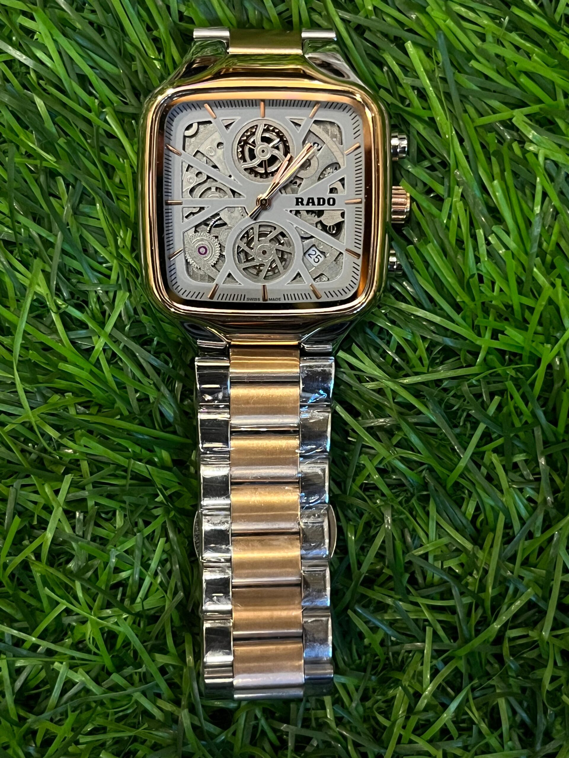 A striking men's watch from R🔥do featuring an intricate skeleton dial that showcases the movement. This model boasts a unique square case in a sophisticated dual-tone silver and rose gold finish, complete with chronograph-style pushers and a date window. Price: ₹2,999/-