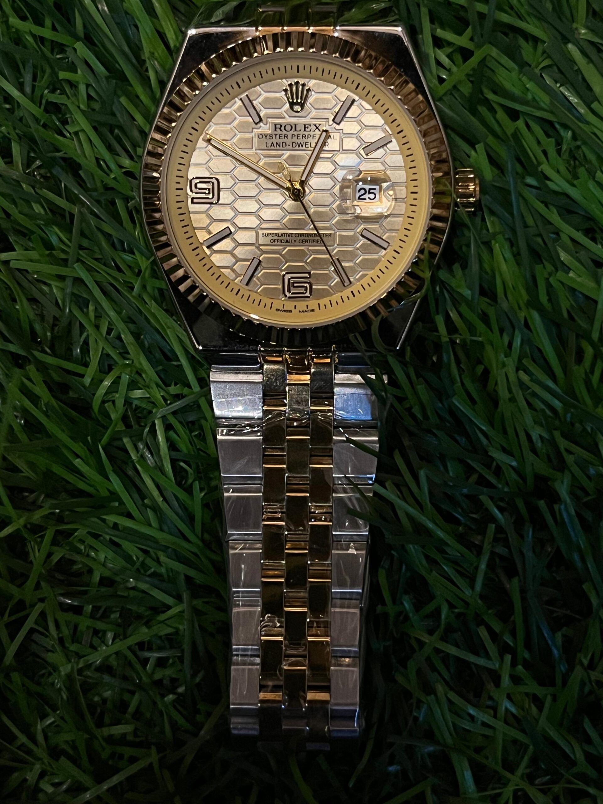 A stunning R🔥lex watch featuring a unique gold honeycomb dial and a classic dual-tone (silver and gold) Jubilee bracelet. The fluted gold bezel and date window add to its timeless elegance. Price: ₹2,399/-
