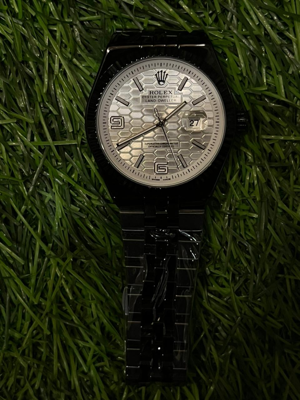 A striking and luxurious timepiece, this R🔥lex Land-Dweller features a unique silver-tone honeycomb dial and a functional date window. The entire watch is encased in a brilliant gold-tone finish, from the fluted bezel to the classic Jubilee bracelet. A perfect blend of intricate design and bold style. Price: ₹2,450/-