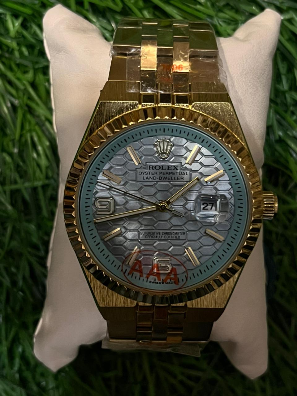 A striking and luxurious timepiece, this R🔥lex Land-Dweller features a unique silver-tone honeycomb dial and a functional date window. The entire watch is encased in a brilliant gold-tone finish, from the fluted bezel to the classic Jubilee bracelet. A perfect blend of intricate design and bold style. Price: ₹2,450/-