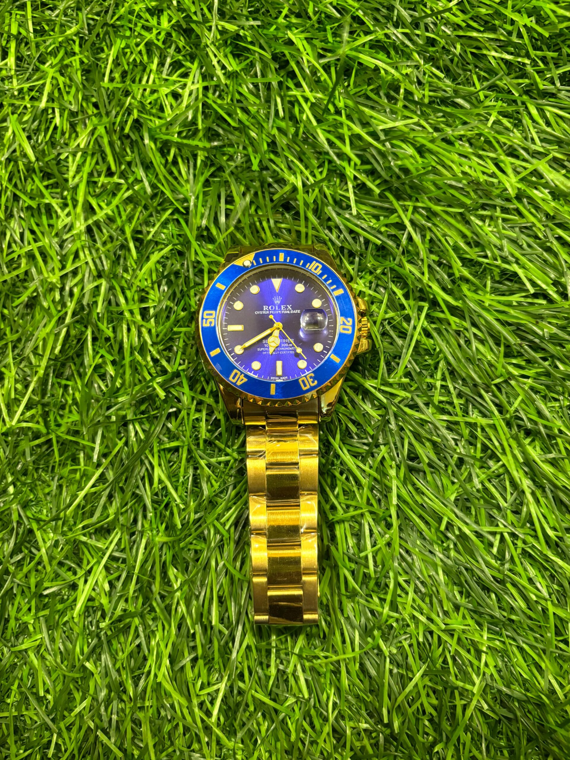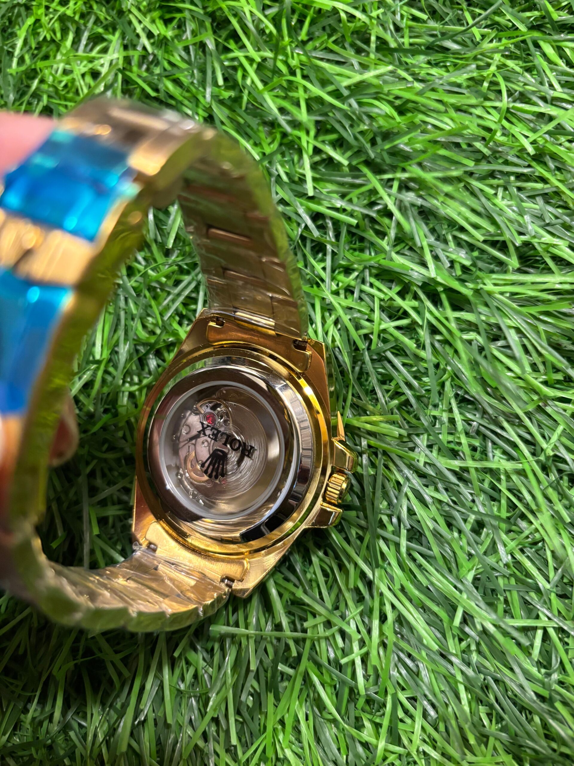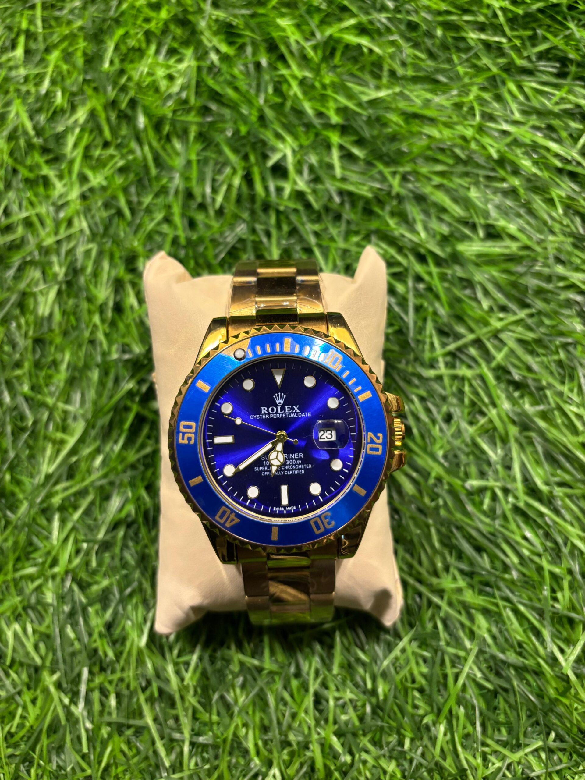 Dive into luxury with the iconic R🔥lex Submariner. This stunning timepiece features a vibrant blue dial and bezel, perfectly contrasted against a radiant gold-plated stainless steel case and bracelet. Its reliable automatic movement is visible through the transparent case back, showcasing the craftsmanship within. A legendary design for the modern man. Price: ₹2,399/-