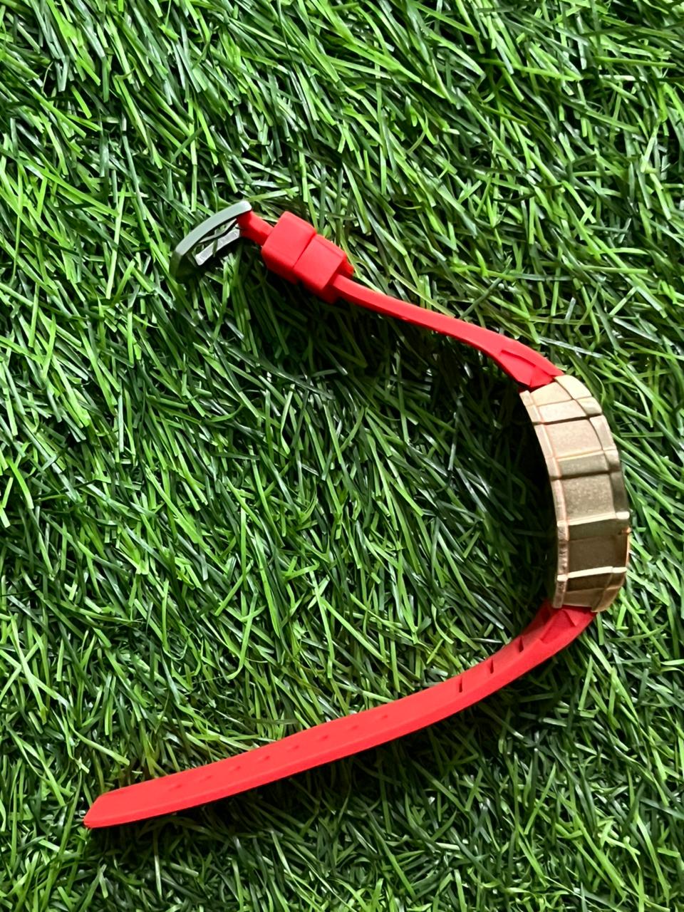 - Build: Robust rose gold-finished case with signature screw detailing and a high-grade, flexible red silicon strap for ultimate comfort.