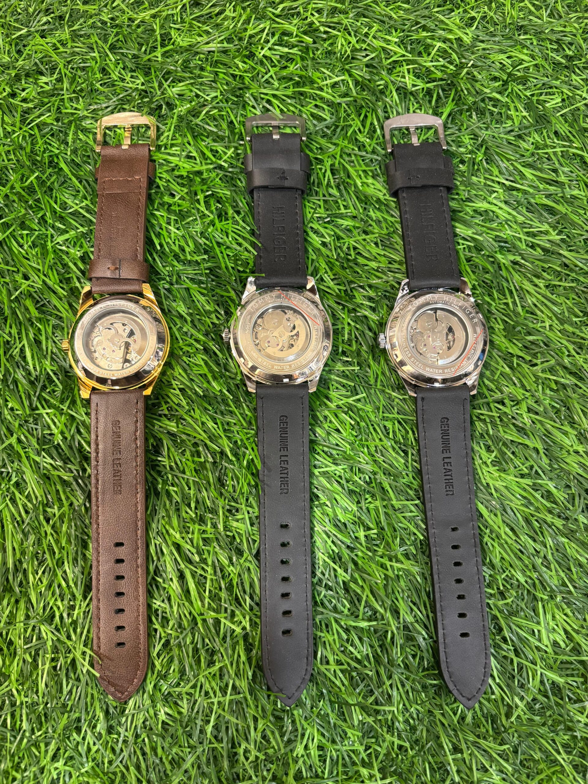 This sophisticated T🔥mmy Hil🔥iger automatic watch showcases a mesmerizing skeleton dial, revealing the intricate craftsmanship of its movement. Paired with a classic genuine leather strap, it offers a timeless look for any occasion. Available in three elegant colour combinations. Price: ₹2,499/-