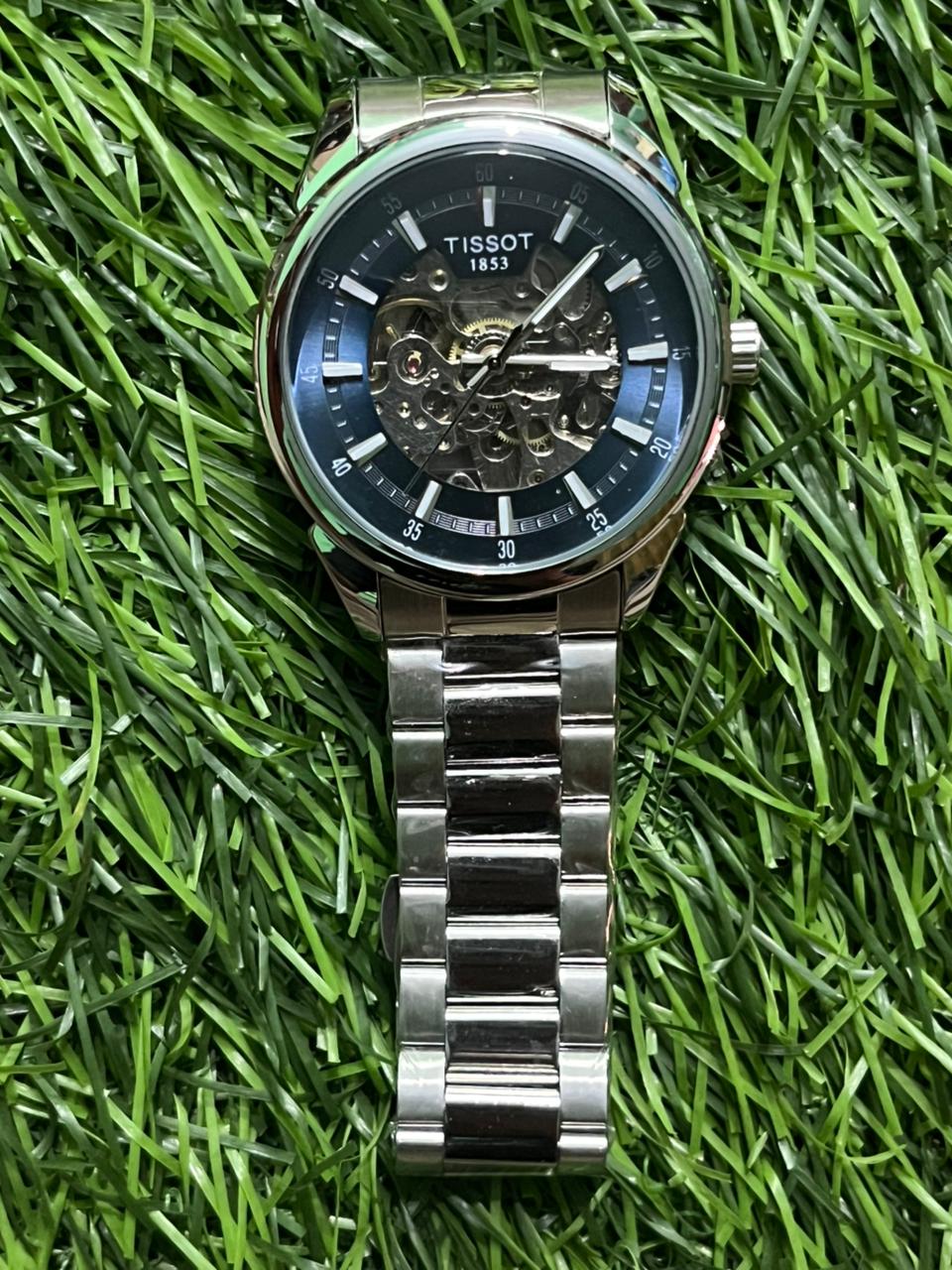 A sophisticated T🔥ss🔥t automatic watch featuring a deep navy blue chapter ring that elegantly frames the skeletonized dial. The inner mechanics are fully visible, showcasing the heartbeat of the watch. Paired with a polished silver stainless steel chain, this timepiece exudes professional elegance. Price: ₹2,750/-