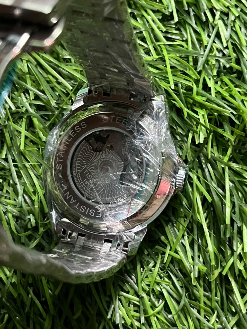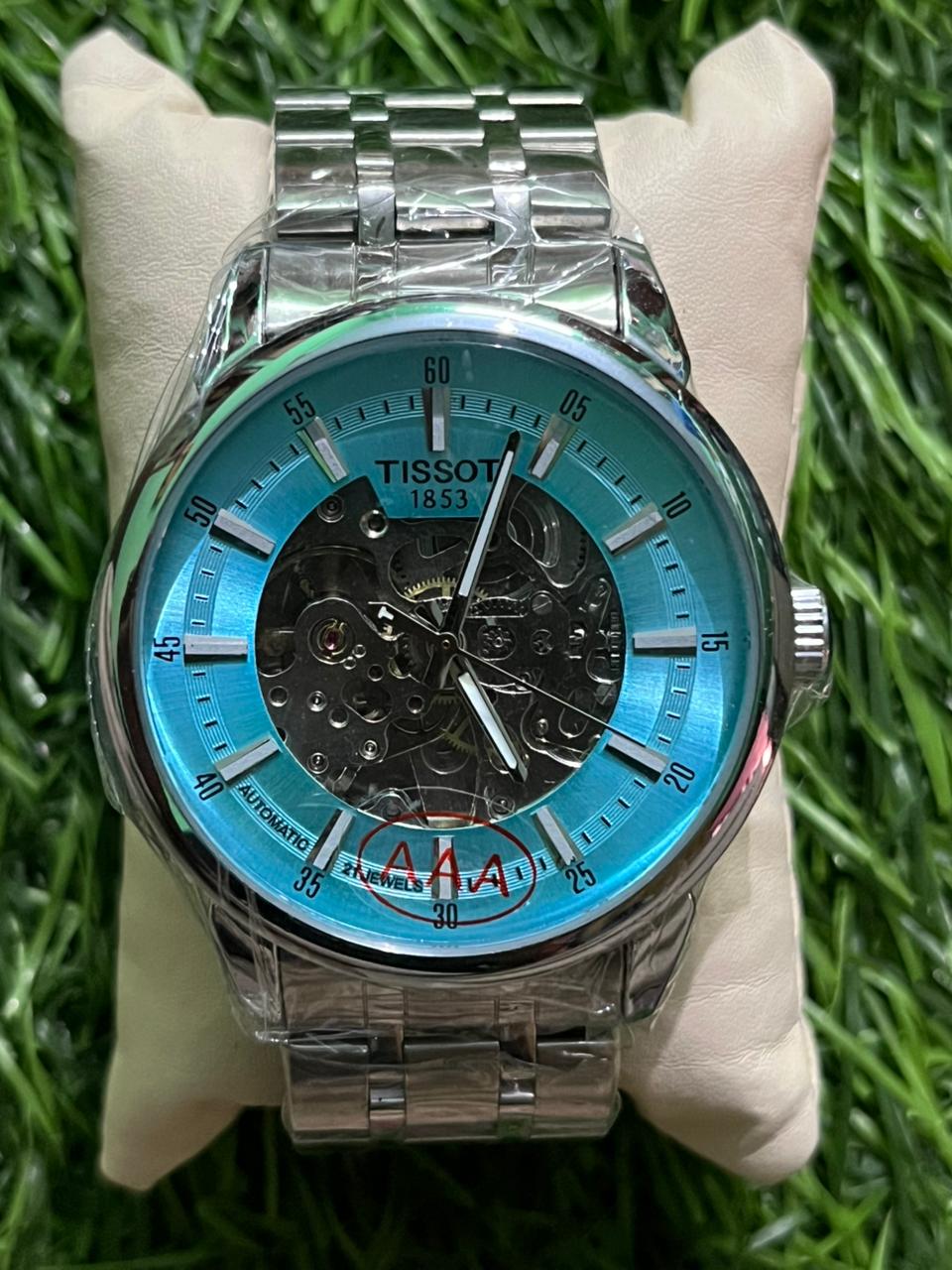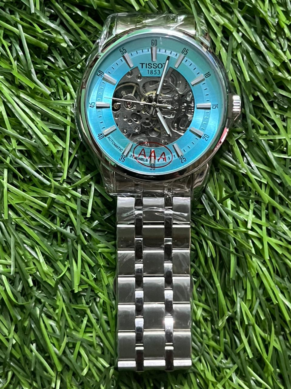This exquisite T🔥ss🔥t timepiece features a captivating skeleton dial framed by a vibrant sky-blue chapter ring, allowing you to admire the intricate 21-jewel automatic movement within. Encased in polished stainless steel with a matching silver chain, it perfectly balances modern boldness with classic mechanics. Price: ₹2,749/-