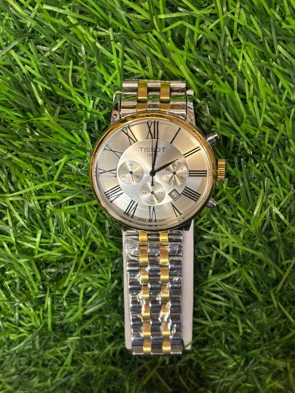 Make a timeless statement with this T🔥ss🔥t chronograph watch. It features a classic silver dial with bold Roman numerals, three subdials, and a date window. The look is perfectly balanced by a gold-tone bezel and a dual-tone stainless steel chain. Price: ₹2,750/-