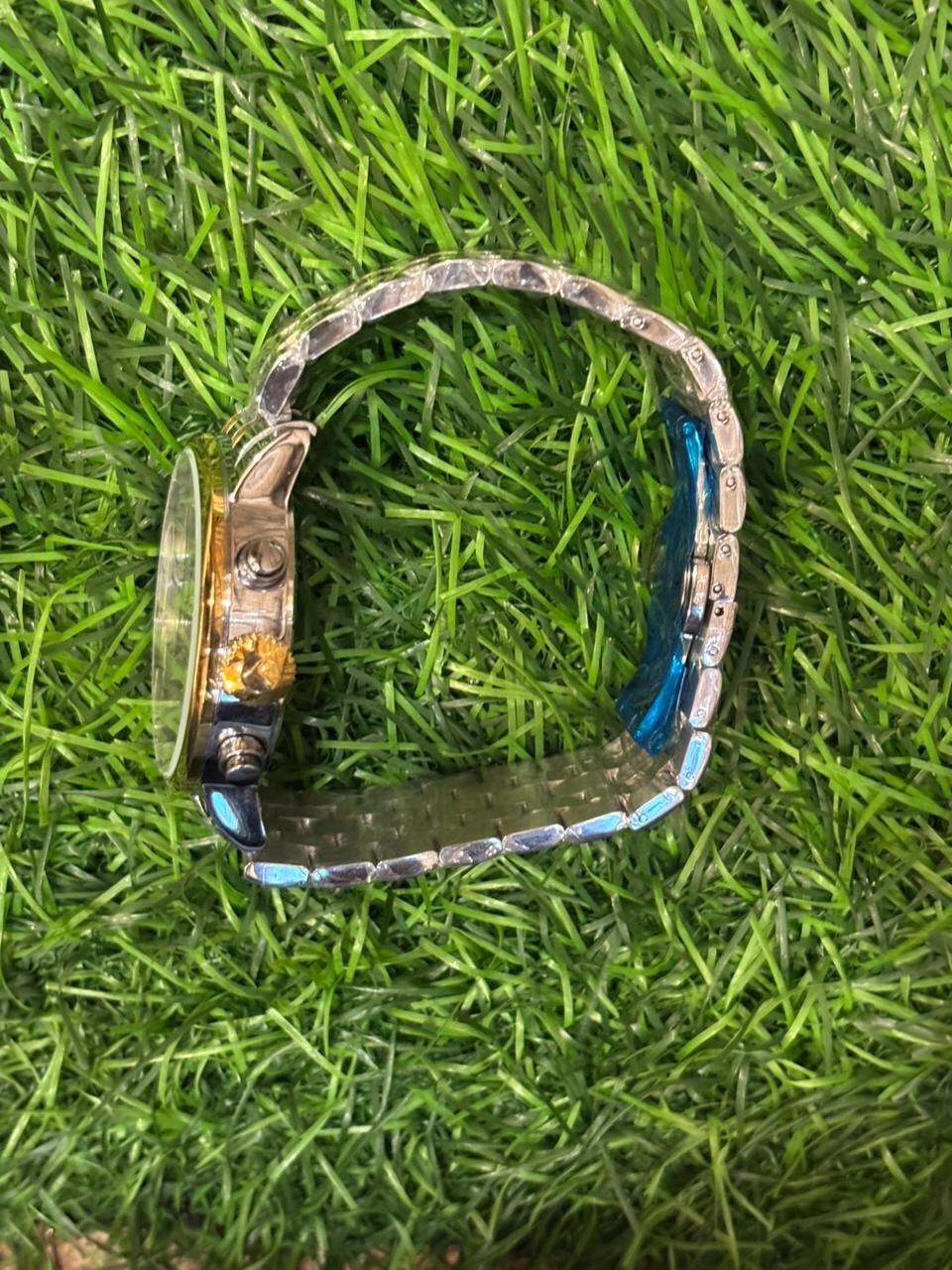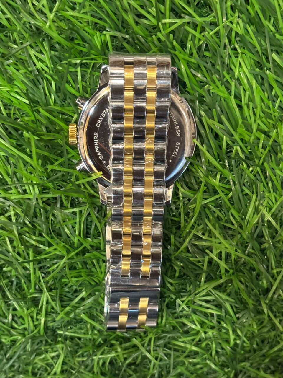 - Build: Crafted with a high-quality stainless steel case and dual-tone bracelet, featuring a detailed chronograph dial with Roman numerals and sapphire-style glass.