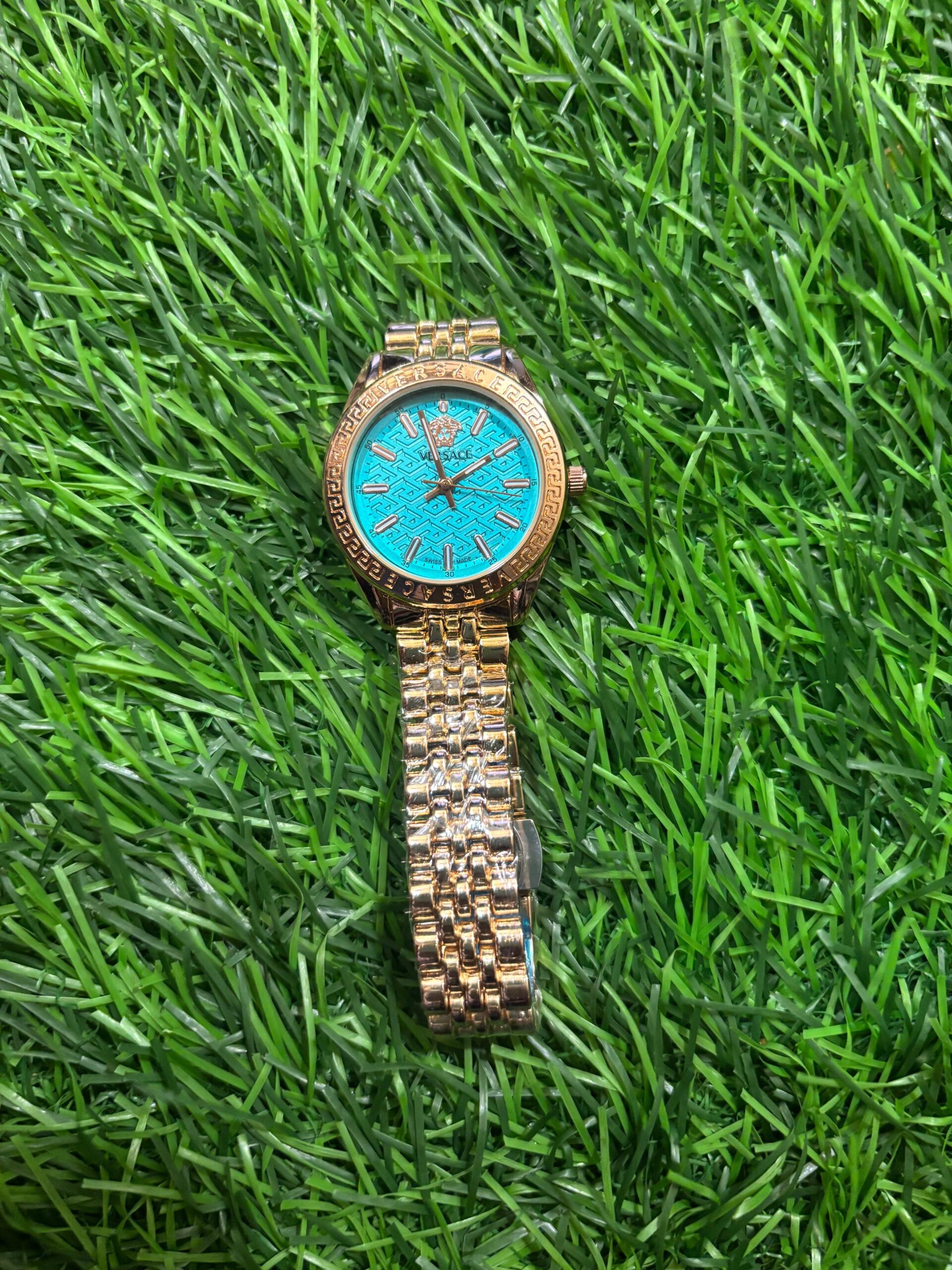 This exquisite V🔥rs🔥ce ladies' watch makes a bold statement with its vibrant teal dial and luxurious golden chain. The intricate detailing on the bezel and dial embodies the iconic style of the brand, perfect for the modern woman. Price: ₹1,949/-